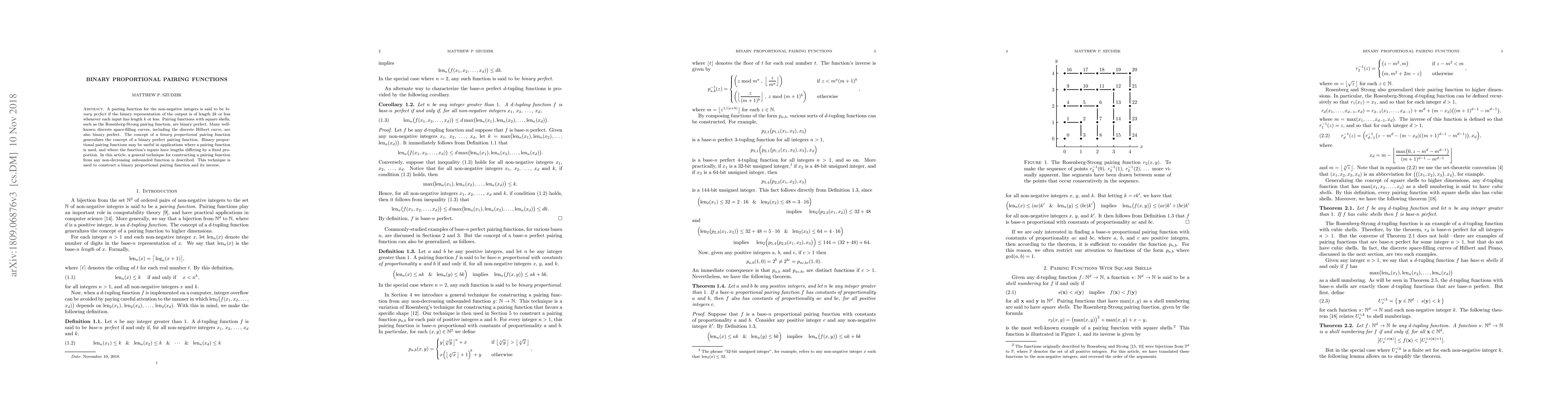 A pairing function for the non-negative integers is said to be binary perfect if the binary representation of the output is of length 2k or less whenever each input has length k or less. Pairing functions with square shells, such as the Rosenberg-Strong pairing function, are binary perfect. Many well-known discrete space-filling curves, including the discrete Hilbert curve, are also binary perfect. The concept of a binary proportional pairing function generalizes the concept of a binary perfect pairing function. Binary proportional pairing functions may be useful in applications where a pairing function is used, and where the function's inputs have lengths differing by a fixed proportion. In this article, a general technique for constructing a pairing function from any non-decreasing unbounded function is described. This technique is used to construct a binary proportional pairing function and its inverse.