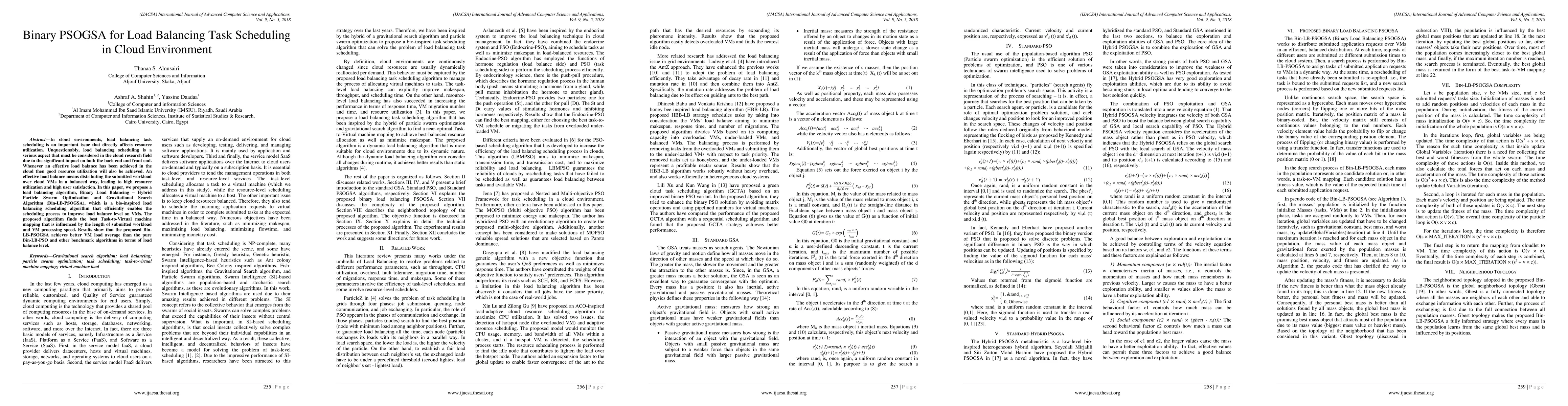 This paper proposes a Binary Load Balancing-Hybrid Particle Swarm Optimization and Gravitational Search Algorithm (Bin-LB-PSOGSA) to enhance load balancing in cloud environments. The algorithm achieves better VM load balancing and higher resource utilization compared to existing methods.