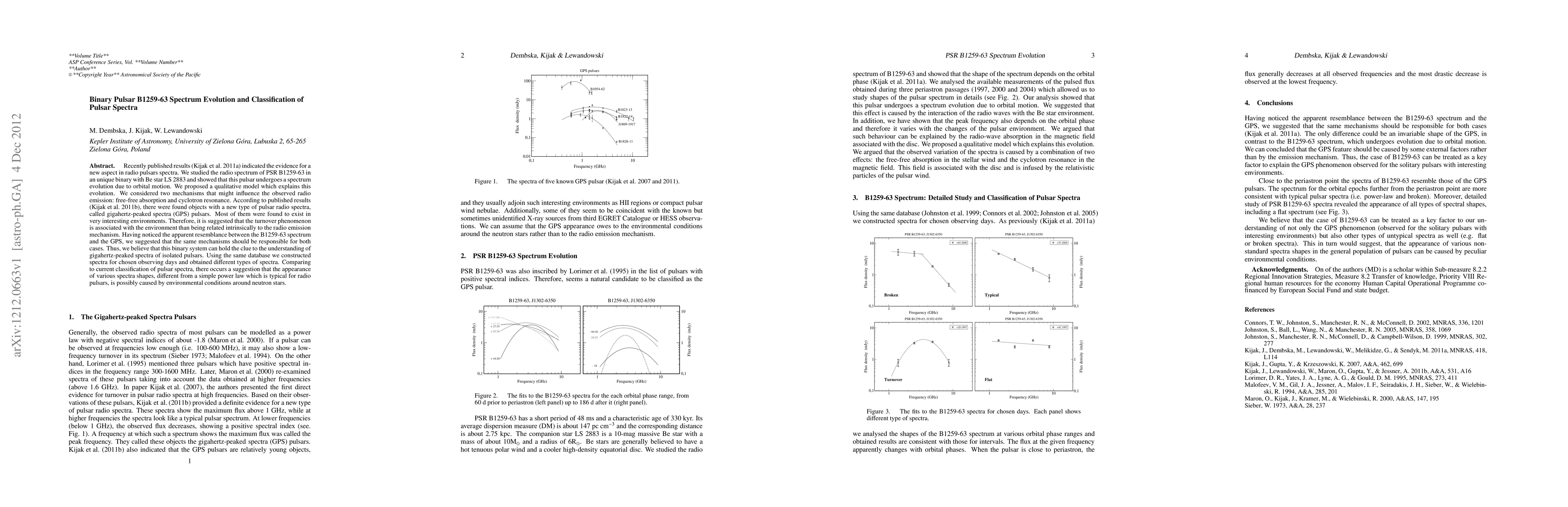 The research examines PSR B1259-63's radio spectrum evolution in its binary system with Be star LS 2883, attributing changes to orbital motion and proposing free-free absorption and cyclotron resonance as influencing mechanisms. The study also links the observed spectrum to gigahertz-peaked spectra (GPS) pulsars, suggesting that environmental conditions around neutron stars may cause various, non-simple power-law spectrum shapes.