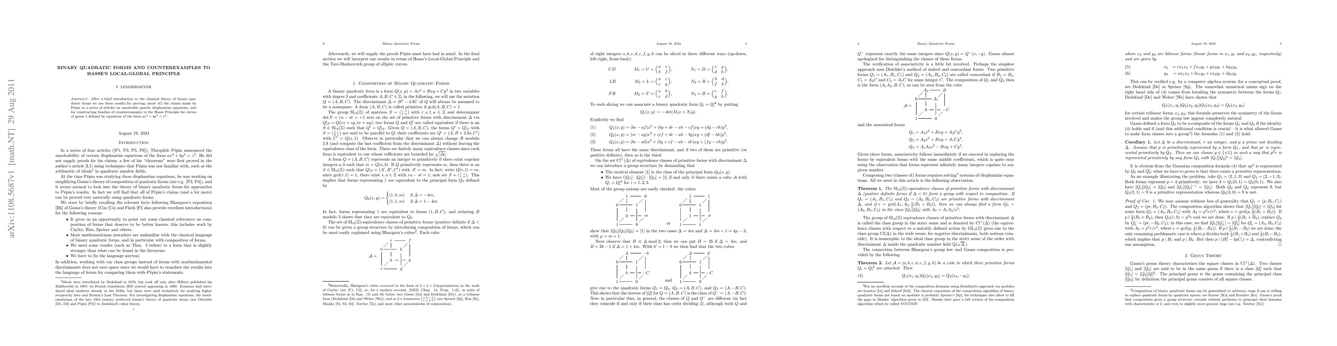 After a brief introduction to the classical theory of binary quadratic forms we use these results for proving (most of) the claims made by P\'epin in a series of articles on unsolvable quartic diophantine equations, and for constructing families of counterexamples to the Hasse Principle for curves of genus 1 defined by equations of the form $ax^4 + by^4 = z^2$.