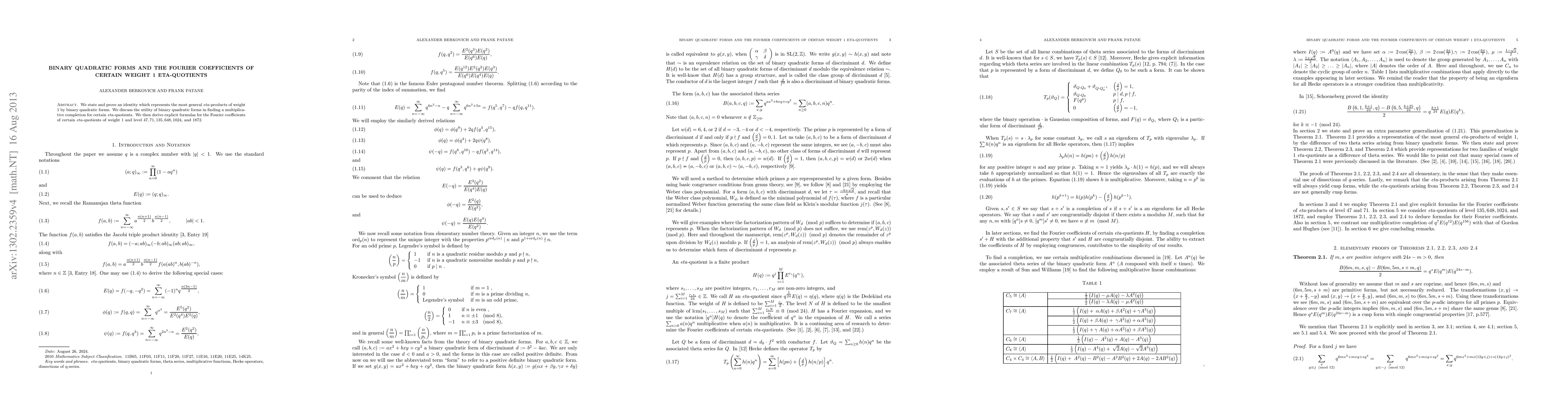 This paper proves an identity linking general eta-products of weight 1 to binary quadratic forms and derives explicit formulas for the Fourier coefficients of specific eta-quotients at levels 47, 71, 135, 648, 1024, and 1872. The use of binary quadratic forms aids in the multiplicative completion of these eta-quotients.