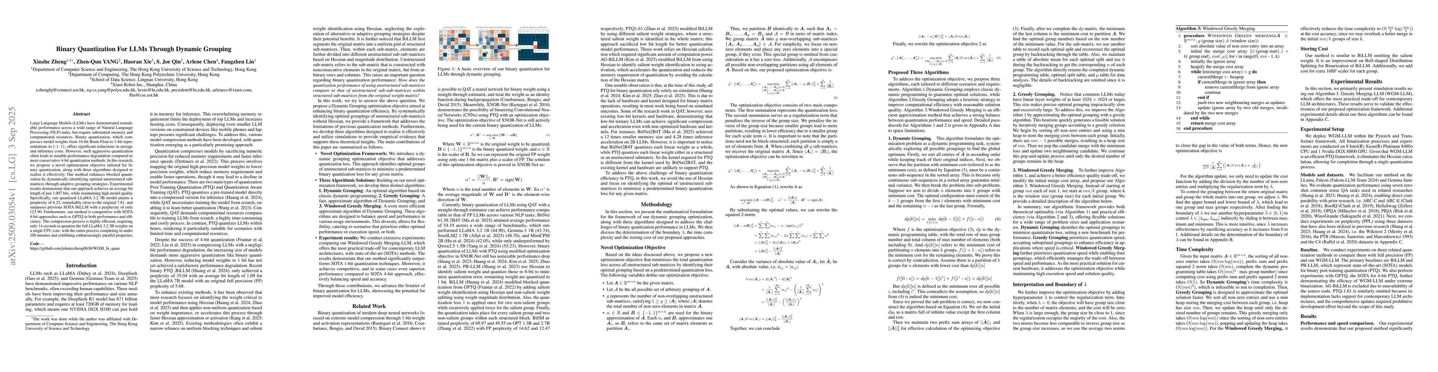Large Language Models (LLMs) have demonstrated remarkable performance across a wide range of Natural Language Processing (NLP) tasks, but require substantial memory and computational resources. Binary quantization, which compresses model weights from 16-bit Brain Float to 1-bit representations in {-1, 1}, offers significant reductions in storage and inference costs. However, such aggressive quantization often leads to notable performance degradation compared to more conservative 4-bit quantization methods. In this research, we propose a novel optimization objective tailored for binary quantization, along with three algorithms designed to realize it effectively. Our method enhances blocked quantization by dynamically identifying optimal unstructured sub-matrices through adaptive grouping strategies. Experimental results demonstrate that our approach achieves an average bit length of just 1.007 bits, while maintaining high model quality. Specifically, our quantized LLaMA 3.2 3B model attains a perplexity of 8.23, remarkably close to the original 7.81, and surpasses previous SOTA BiLLM with a perplexity of only 123.90. Furthermore, our method is competitive with SOTA 4-bit approaches such as GPTQ in both performance and efficiency. The compression process is highly efficient, requiring only 14 seconds to quantize the full LLaMA 3.2 3B weights on a single CPU core, with the entire process completing in under 100 minutes and exhibiting embarrassingly parallel properties. Code - https://github.com/johnnyzheng0636/WGM_bi_quan