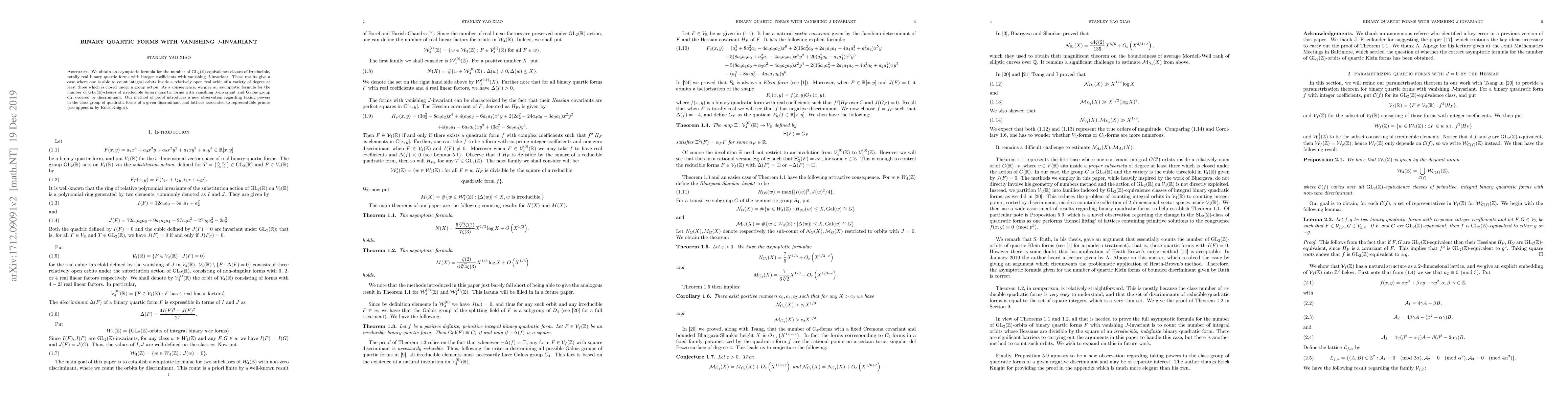 This research provides an asymptotic formula for counting specific equivalence classes of binary quartic forms with integer coefficients and vanishing J-invariant. The study focuses on forms whose Hessians are related to squares of reducible or positive definite quadratic forms, offering insights into counting integral orbits within open real orbits of varieties under degree-at-least-three group actions.