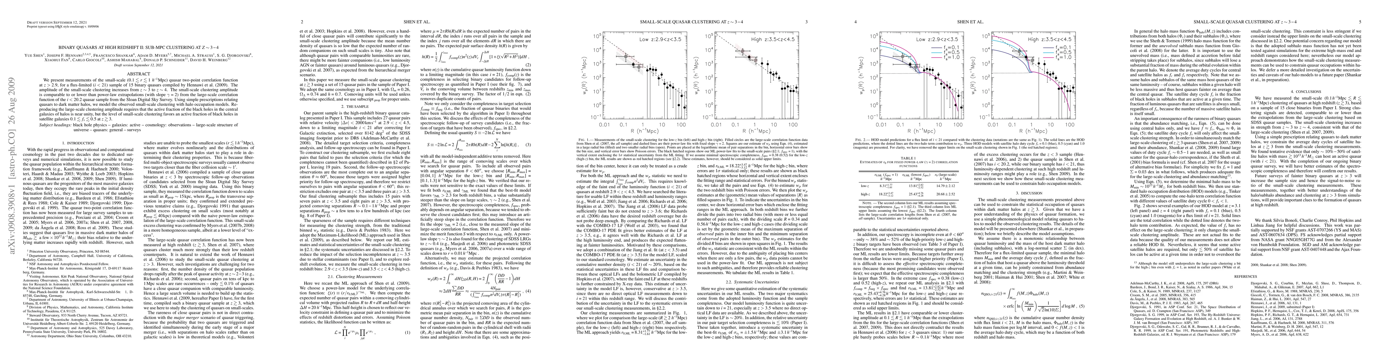 This paper measures the small-scale clustering of binary quasars at high redshift (z ~ 3-4) and finds that the clustering amplitude increases from z ~ 3 to z ~ 4. The study suggests that while large-scale clustering implies nearly all central black holes are active, small-scale clustering indicates a lower active fraction in satellite galaxies, around 0.1 <~ f_s <~ 0.5.