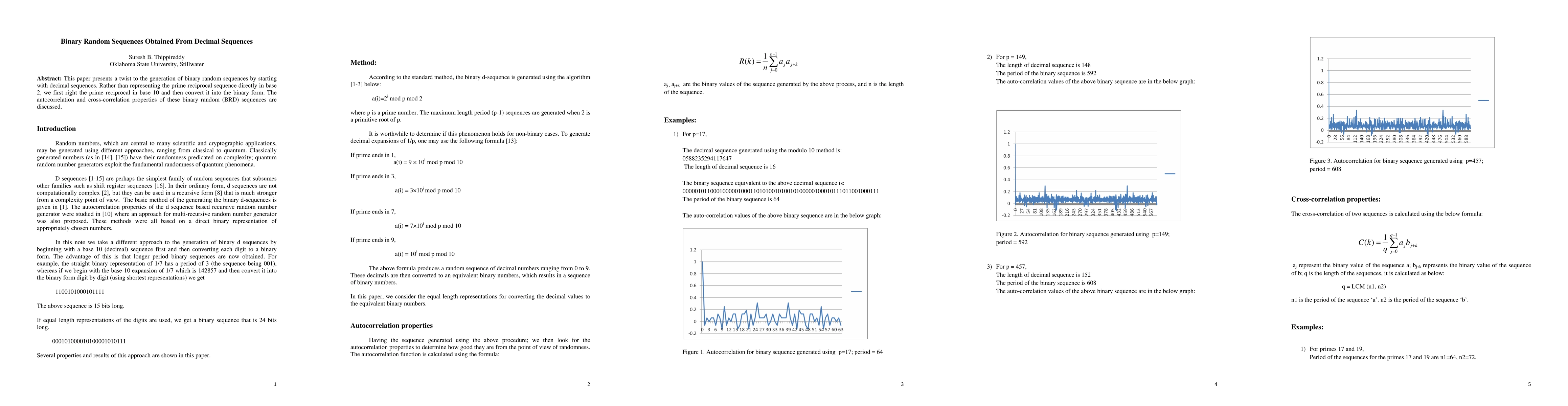 This paper presents a twist to the generation of binary random sequences by starting with decimal sequences. Rather than representing the prime reciprocal sequence directly in base 2, we first right the prime reciprocal in base 10 and then convert it into the binary form. The autocorrelation and cross-correlation properties of these binary random (BRD) sequences are discussed.