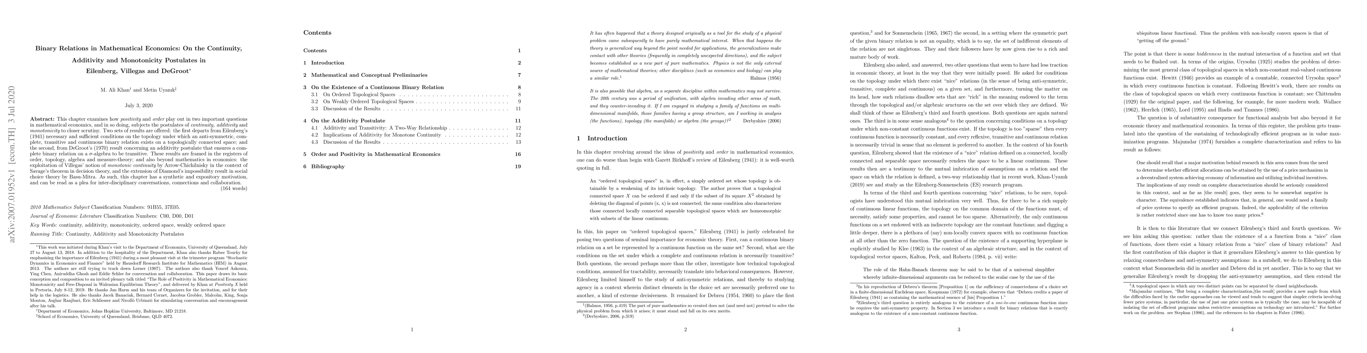 This chapter examines how positivity and order play out in two important questions in mathematical economics, and in so doing, subjects the postulates of continuity, additivity and monotonicity to closer scrutiny. Two sets of results are offered: the first departs from Eilenberg's (1941) necessary and sufficient conditions on the topology under which an anti-symmetric, complete, transitive and continuous binary relation exists on a topologically connected space; and the second, from DeGroot's (1970) result concerning an additivity postulate that ensures a complete binary relation on a {\sigma}-algebra to be transitive. These results are framed in the registers of order, topology, algebra and measure-theory; and also beyond mathematics in economics: the exploitation of Villegas' notion of monotonic continuity by Arrow-Chichilnisky in the context of Savage's theorem in decision theory, and the extension of Diamond's impossibility result in social choice theory by Basu-Mitra. As such, this chapter has a synthetic and expository motivation, and can be read as a plea for inter-disciplinary conversations, connections and collaboration.