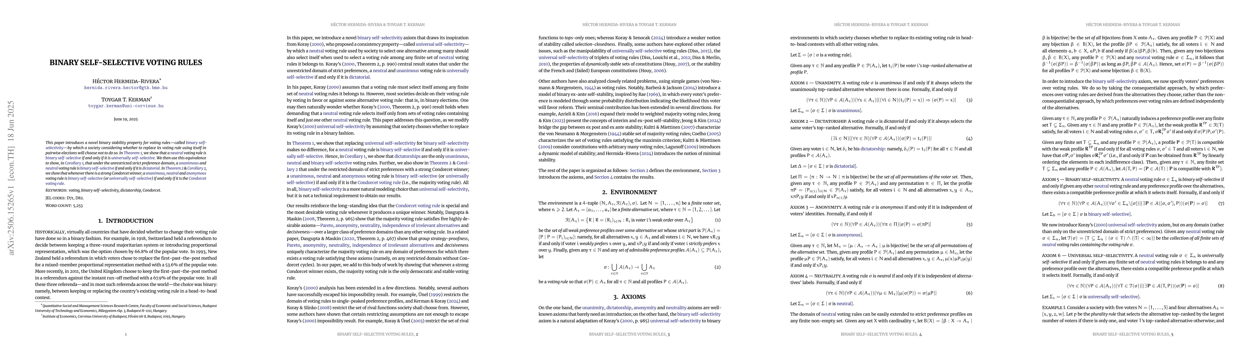 This paper introduces a novel binary stability property for voting rules-called binary self-selectivity-by which a society considering whether to replace its voting rule using itself in pairwise elections will choose not to do so. In Theorem 1, we show that a neutral voting rule is binary self-selective if and only if it is universally self-selective. We then use this equivalence to show, in Corollary 1, that under the unrestricted strict preference domain, a unanimous and neutral voting rule is binary self-selective if and only if it is dictatorial. In Theorem 2 and Corollary 2, we show that whenever there is a strong Condorcet winner; a unanimous, neutral and anonymous voting rule is binary self-selective (or universally self-selective) if and only if it is the Condorcet voting rule.