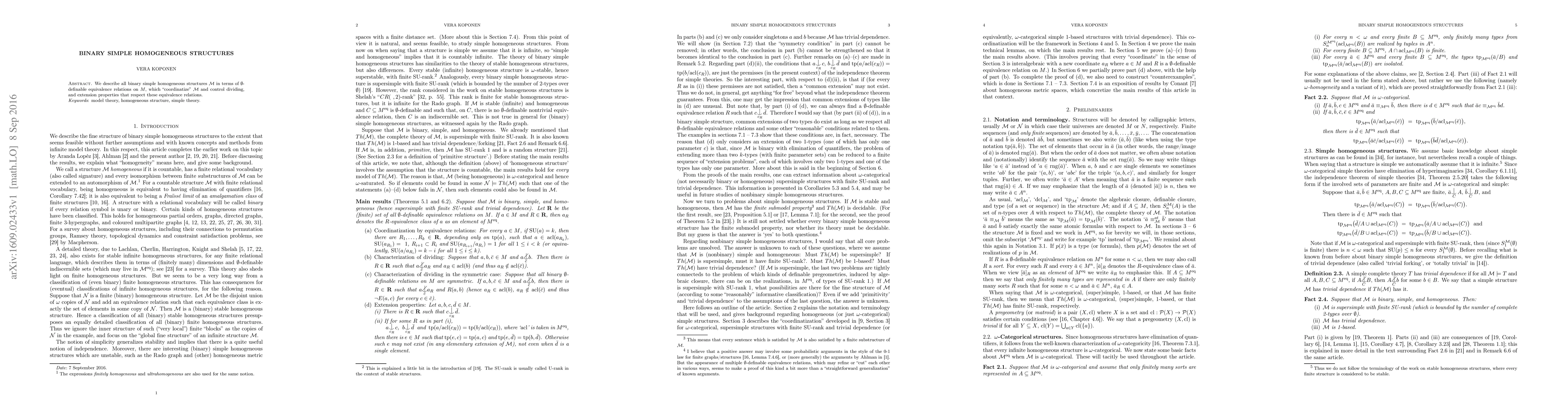 We describe all binary simple homogeneous structures M in terms of 0-definable equivalence relations on M, which "coordinatize" M and control dividing, and extension properties that respect these equivalence relations.
