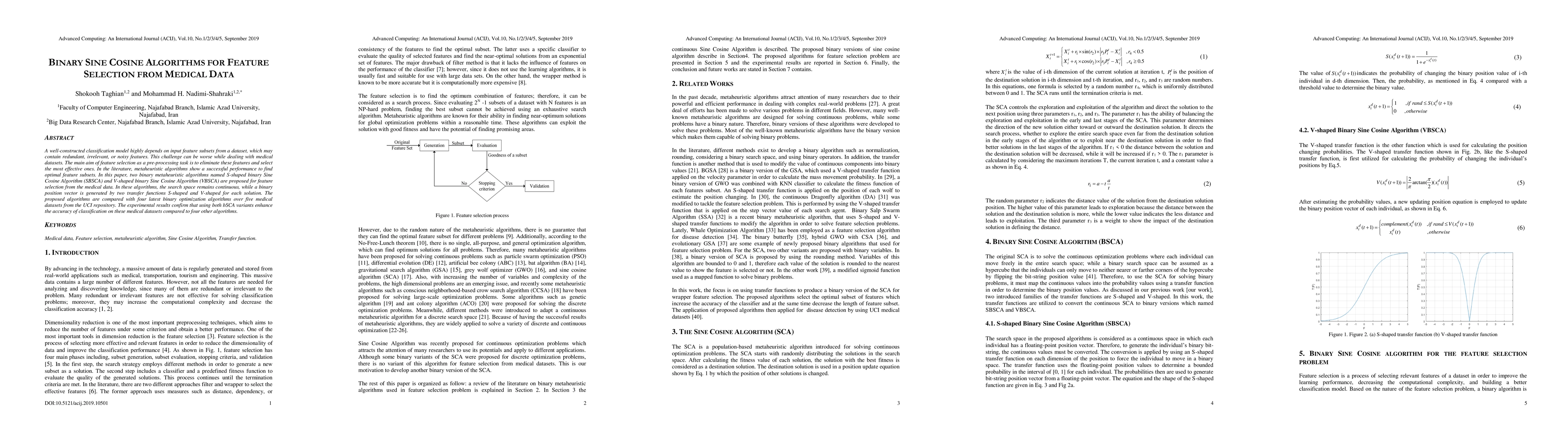 A well-constructed classification model highly depends on input feature subsets from a dataset, which may contain redundant, irrelevant, or noisy features. This challenge can be worse while dealing with medical datasets. The main aim of feature selection as a pre-processing task is to eliminate these features and select the most effective ones. In the literature, metaheuristic algorithms show a successful performance to find optimal feature subsets. In this paper, two binary metaheuristic algorithms named S-shaped binary Sine Cosine Algorithm (SBSCA) and V-shaped binary Sine Cosine Algorithm (VBSCA) are proposed for feature selection from the medical data. In these algorithms, the search space remains continuous, while a binary position vector is generated by two transfer functions S-shaped and V-shaped for each solution. The proposed algorithms are compared with four latest binary optimization algorithms over five medical datasets from the UCI repository. The experimental results confirm that using both bSCA variants enhance the accuracy of classification on these medical datasets compared to four other algorithms.