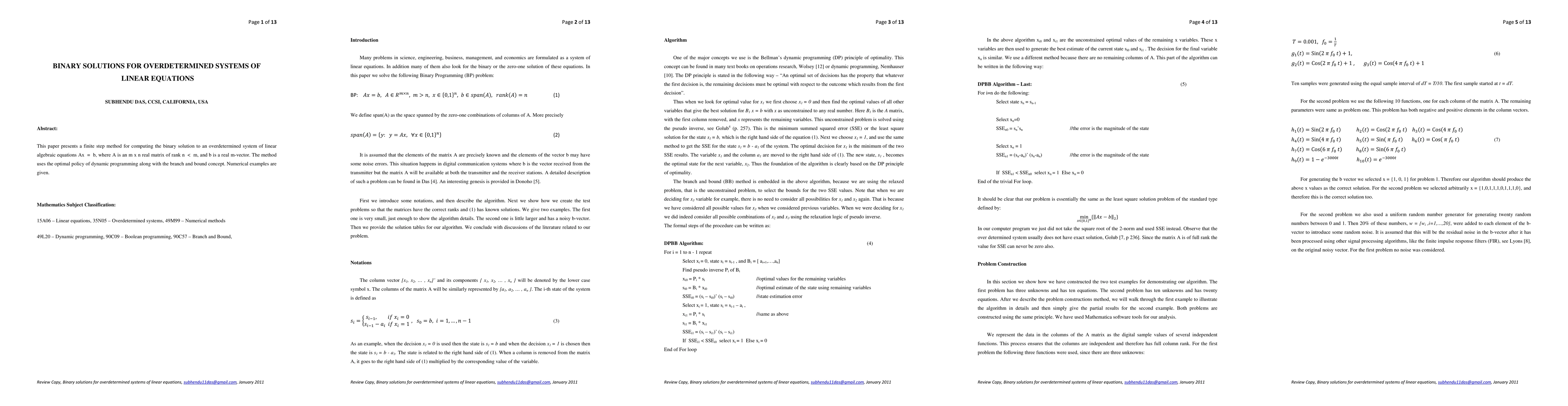 This paper proposes a finite step method for finding binary solutions to overdetermined linear systems using dynamic programming and branch and bound techniques, with numerical examples provided to demonstrate its effectiveness.