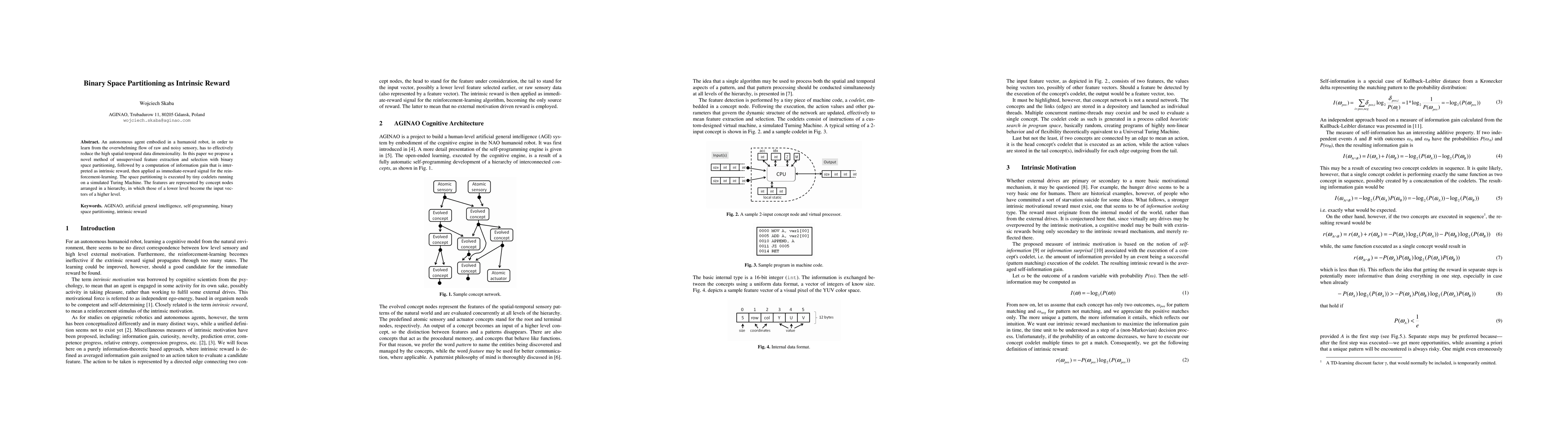 This paper proposes an unsupervised method for feature extraction and selection using binary space partitioning, which computes information gain as intrinsic reward for reinforcement learning in a humanoid robot. The method employs tiny codelets on a Turing Machine to manage spatial-temporal data dimensionality.