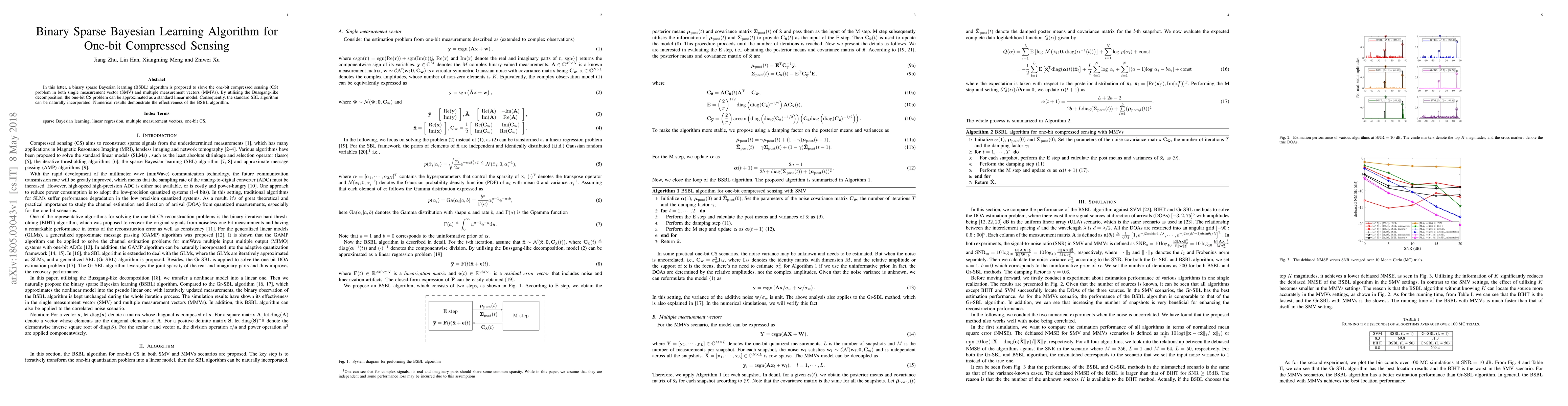 The paper proposes a binary sparse Bayesian learning (BSBL) algorithm to tackle the one-bit compressed sensing problem for both single and multiple measurement vectors. It utilizes Bussgang-like decomposition to approximate the problem as a standard linear model, enabling the application of the standard SBL algorithm, with numerical results showing its effectiveness.