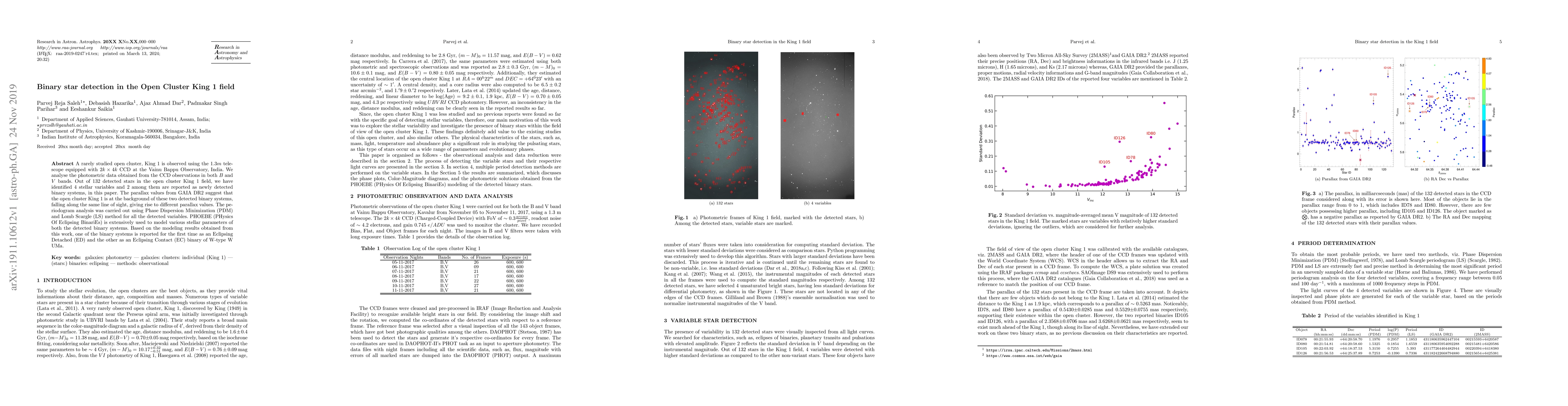 A rarely studied open cluster, King 1 is observed using the 1.3m telescope equipped with 2k x 4k CCD at the Vainu Bappu Observatory, India. We analyse the photometric data obtained from the CCD observations in both B and V bands. Out of 132 detected stars in the open cluster King 1 field, we have identified 4 stellar variables and 2 among them are reported as newly detected binary systems, in this paper. The parallax values from GAIA DR2 suggest that the open cluster King 1 is at the background of these two detected binary systems, falling along the same line of sight, giving rise to different parallax values. The periodogram analysis was carried out using Phase Dispersion Minimization (PDM) and Lomb Scargle (LS) method for all the detected variables. PHOEBE (PHysics Of Eclipsing BinariEs) is extensively used to model various stellar parameters of both the detected binary systems. Based on the modeling results obtained from this work, one of the binary systems is reported for the first time as an Eclipsing Detached (ED) and the other as an Eclipsing Contact (EC) binary of W-type W UMa.