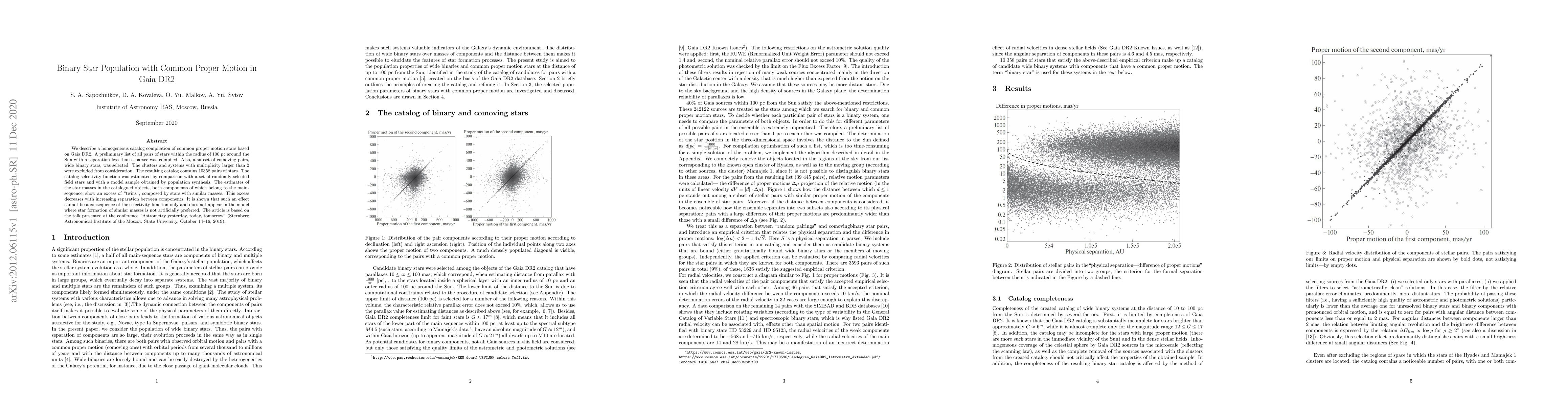 We describe a homogeneous catalog compilation of common proper motion stars based on Gaia DR2. A preliminary list of all pairs of stars within the radius of 100 pc around the Sun with a separation less than a parsec was compiled. Also, a subset of comoving pairs, wide binary stars, was selected. The clusters and systems with multiplicity larger than 2 were excluded from consideration. The resulting catalog contains 10358 pairs of stars. The catalog selectivity function was estimated by comparison with a set of randomly selected field stars and with a model sample obtained by population synthesis. The estimates of the star masses in the catalogued objects, both components of which belong to the main-sequence, show an excess of "twins", composed by stars with similar masses. This excess decreases with increasing separation between components. It is shown that such an effect cannot be a consequence of the selectivity function only and does not appear in the model where star formation of similar masses is not artificially preferred. The article is based on the talk presented at the conference "Astrometry yesterday, today, tomorrow" (Sternberg Astronomical Institute of the Moscow State University, October 14-16, 2019).