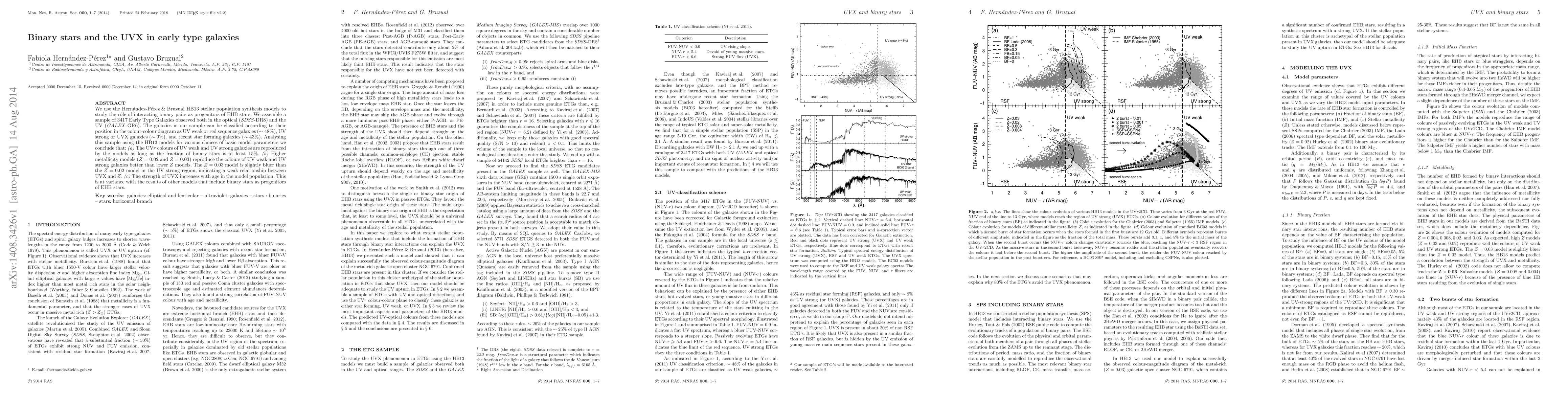We use the Hern\'andez-P\'erez $\&$ Bruzual (2013) HB13 stellar population synthesis models to study the r\^ole of interacting binary pairs as progenitors of EHB stars. We assemble a sample of 3417 Early Type Galaxies observed both in the optical (\textit{SDSS}-DR8) and the UV (\textit{GALEX}-GR6). The galaxies in our sample can be classified according to their position in the colour-colour diagram as UV weak or red sequence galaxies ($\sim 48\%$), UV strong or UVX galaxies ($\sim 9\%$), and recent star forming galaxies ($\sim 43\%$). Analysing this sample using the HB13 models for various choices of basic model parameters we conclude that: (a) The UV$r$ colours of UV weak and UV strong galaxies are reproduced by the models as long as the fraction of binary stars is at least 15$\%.$ (b) Higher metallicity models ($Z = 0.02$ and $Z = 0.03$) reproduce the colours of UV weak and UV strong galaxies better than lower $Z$ models. The $Z = 0.03$ model is slightly bluer than the $Z = 0.02$ model in the UV strong region, indicating a weak relationship between UVX and $Z$. (c) The strength of UVX increases with age in the model population. This is at variance with the results of other models that include binary stars as progenitors of EHB stars.