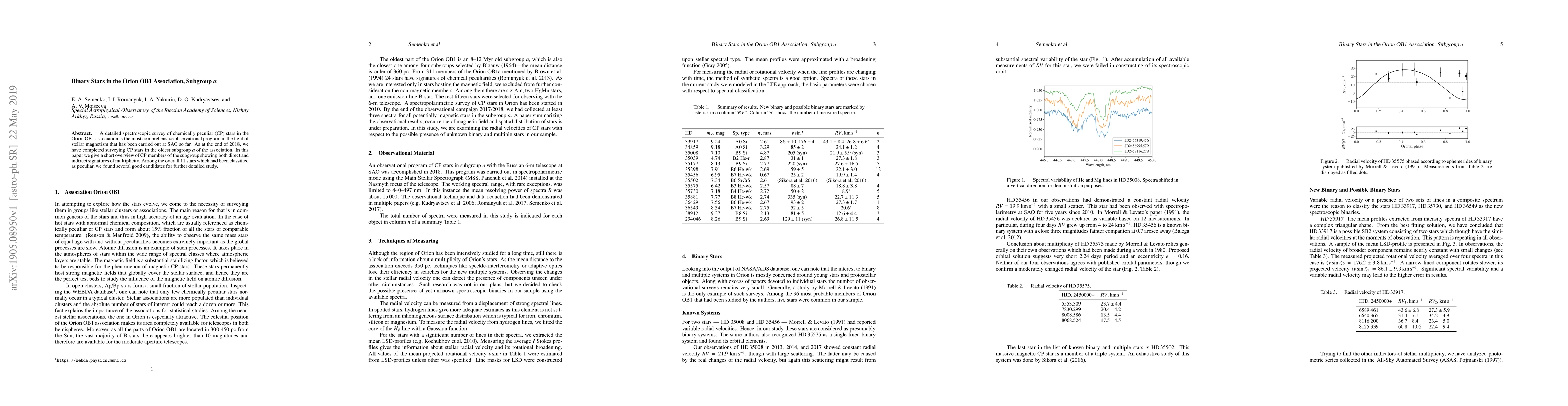 This paper presents a detailed spectroscopic survey of chemically peculiar stars in the Orion OB1 association's subgroup a, revealing several binary stars showing signs of multiplicity among the 11 identified peculiar stars, suggesting potential for further detailed study.