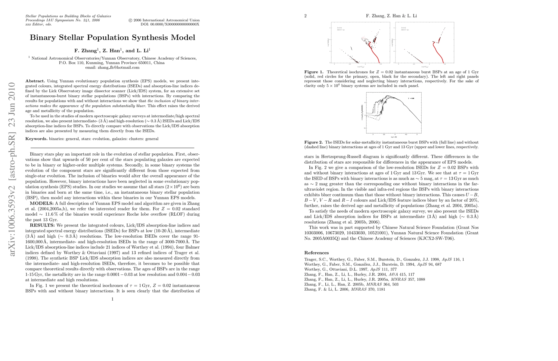 This paper presents Yunnan EPS models for binary stellar populations, showing that binary interactions make populations appear bluer and increase derived age and metallicity. It provides integrated spectral energy distributions and Lick/IDS absorption-line indices for use in modern spectroscopic galaxy surveys.