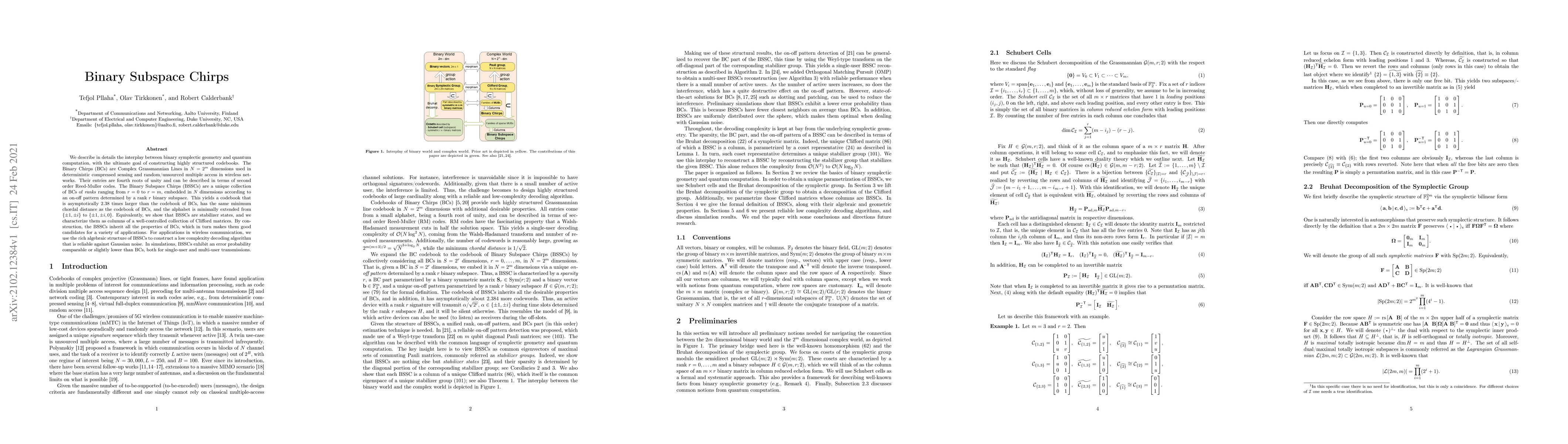 We describe in details the interplay between binary symplectic geometry and quantum computation, with the ultimate goal of constructing highly structured codebooks. The Binary Chirps (BCs) are Complex Grassmannian Lines in $N = 2^m$ dimensions used in deterministic compressed sensing and random/unsourced multiple access in wireless networks. Their entries are fourth roots of unity and can be described in terms of second order Reed-Muller codes. The Binary Subspace Chirps (BSSCs) are a unique collection of BCs of $\textit{ranks}$ ranging from $r=0$ to $r = m$, embedded in $N$ dimensions according to an on-off pattern determined by a rank $r$ binary subspace. This yields a codebook that is asymptotically 2.38 times larger than the codebook of BCs, has the same minimum chordal distance as the codebook of BCs, and the alphabet is minimally extended from $\{\pm 1,\pm i\}$ to $\{\pm 1,\pm i, 0\}$. Equivalently, we show that BSSCs are stabilizer states, and we characterize them as columns of a well-controlled collection of Clifford matrices. By construction, the BSSCs inherit all the properties of BCs, which in turn makes them good candidates for a variety of applications. For applications in wireless communication, we use the rich algebraic structure of BSSCs to construct a low complexity decoding algorithm that is reliable against Gaussian noise. In simulations, BSSCs exhibit an error probability comparable or slightly lower than BCs, both for single-user and multi-user transmissions.