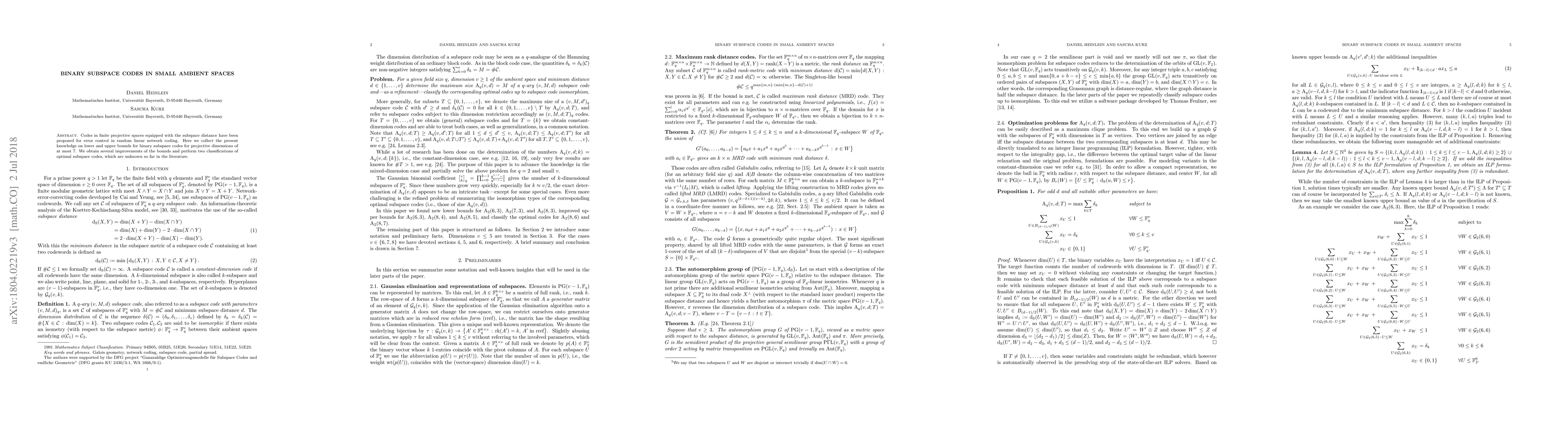 This paper reviews current knowledge on lower and upper bounds for binary subspace codes in projective dimensions up to 7, improving existing bounds and classifying optimal codes, which have not been documented previously.