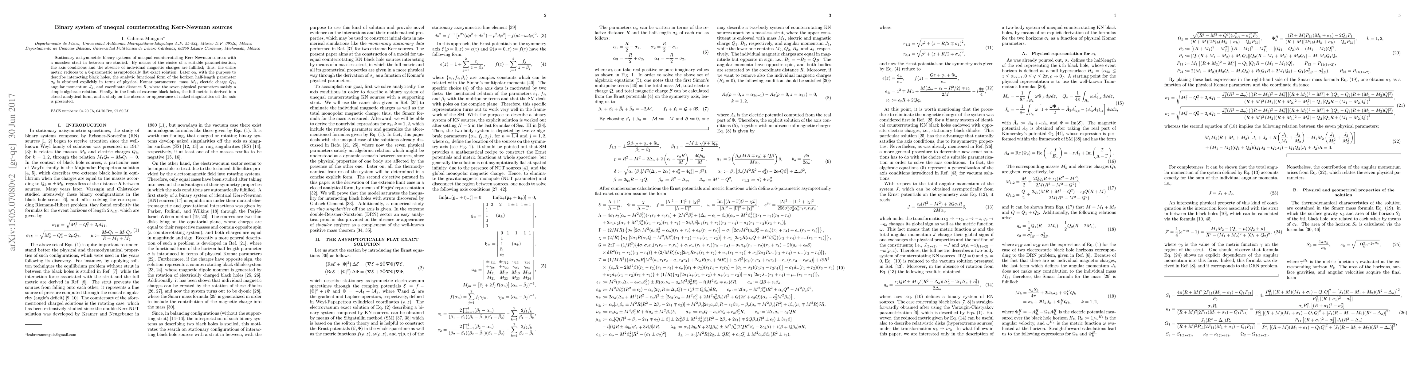 Stationary axisymmetric binary systems of unequal counterrotating Kerr-Newman sources with a massless strut in between are studied. By means of the choice of a suitable parametrization, the axis conditions and the absence of individual magnetic charges are fulfilled; thus, the entire metric reduces to a 6-parametric asymptotically flat exact solution. Later on, with the purpose to describe interacting black holes, the analytic functional form of the horizon half-length parameter $\sigma_{k}$ is obtained explicitly in terms of physical Komar parameters: mass $M_{k}$, electric charge $Q_{k}$, angular momentum $J_{k}$, and coordinate distance $R$, where the seven physical parameters satisfy a simple algebraic relation. Finally, in the limit of extreme black holes, the full metric is derived in a closed analytical form, and a study on the absence or appearance of naked singularities off the axis is presented.