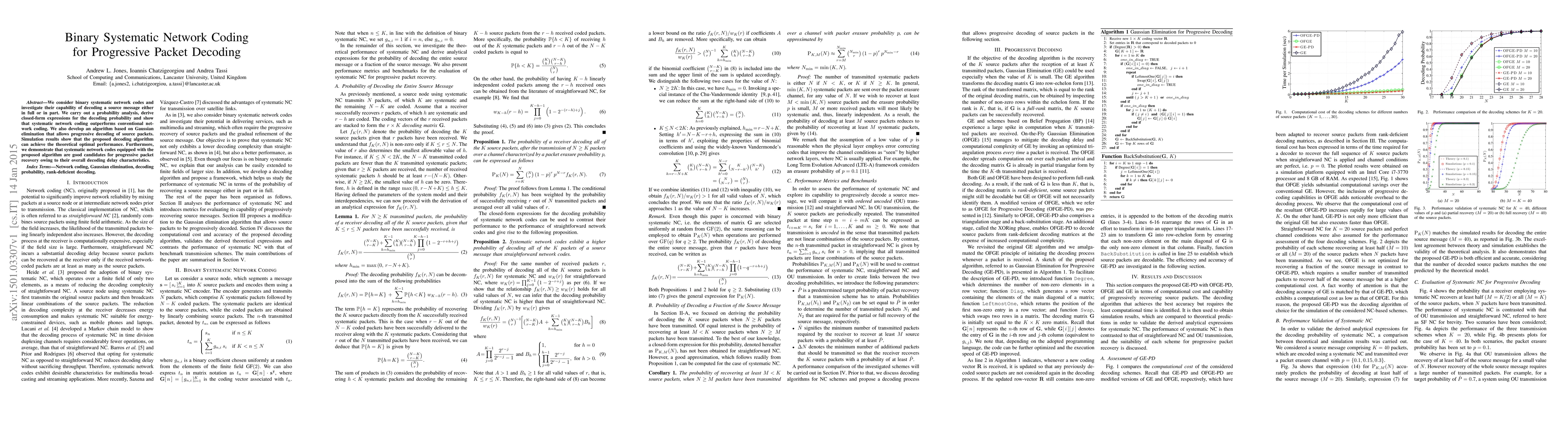 This paper explores binary systematic network codes for progressive packet decoding, deriving closed-form expressions for decoding probability and demonstrating that they outperform conventional methods. An algorithm based on Gaussian elimination enables progressive decoding, achieving optimal performance in simulations and showing good delay characteristics for progressive packet recovery.