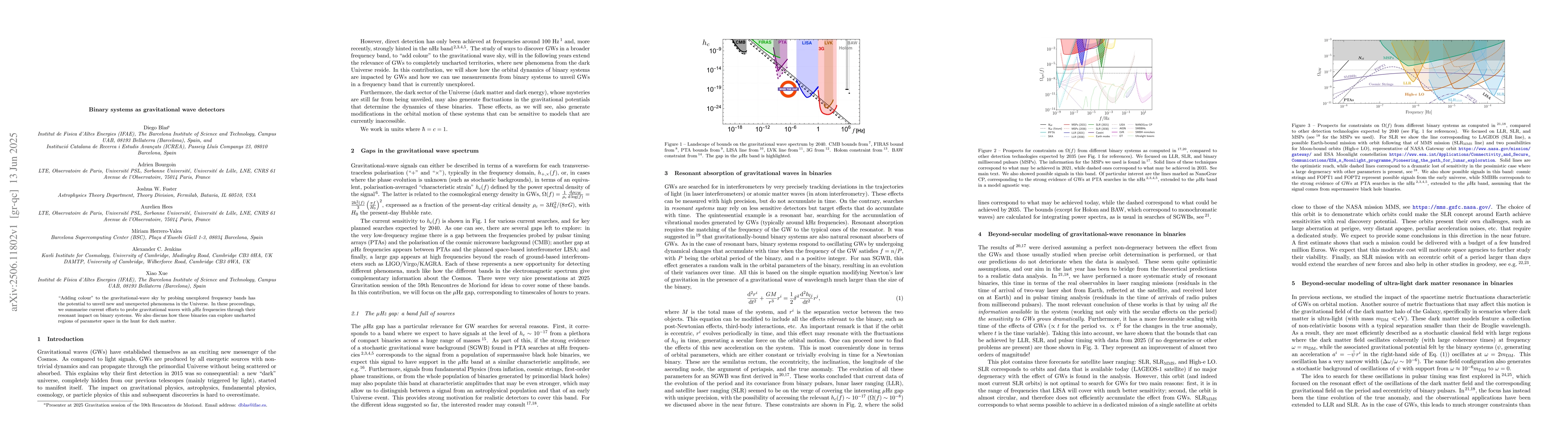 The research explores the use of binary systems as gravitational wave detectors, focusing on resonant absorption in binaries and their potential to probe unexplored frequency bands, including the µHz gap, and to search for dark matter.