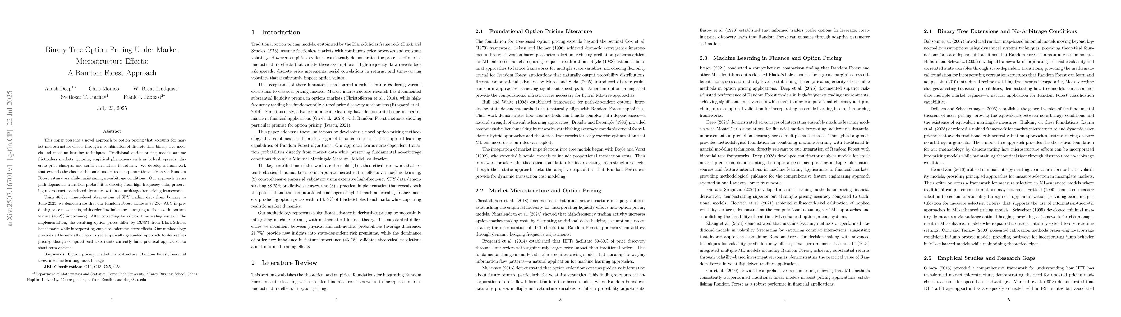 The paper proposes a machine learning-based extension of the classical binomial option pricing model, incorporating market microstructure effects via Random Forest classifiers trained on high-frequency market data.
