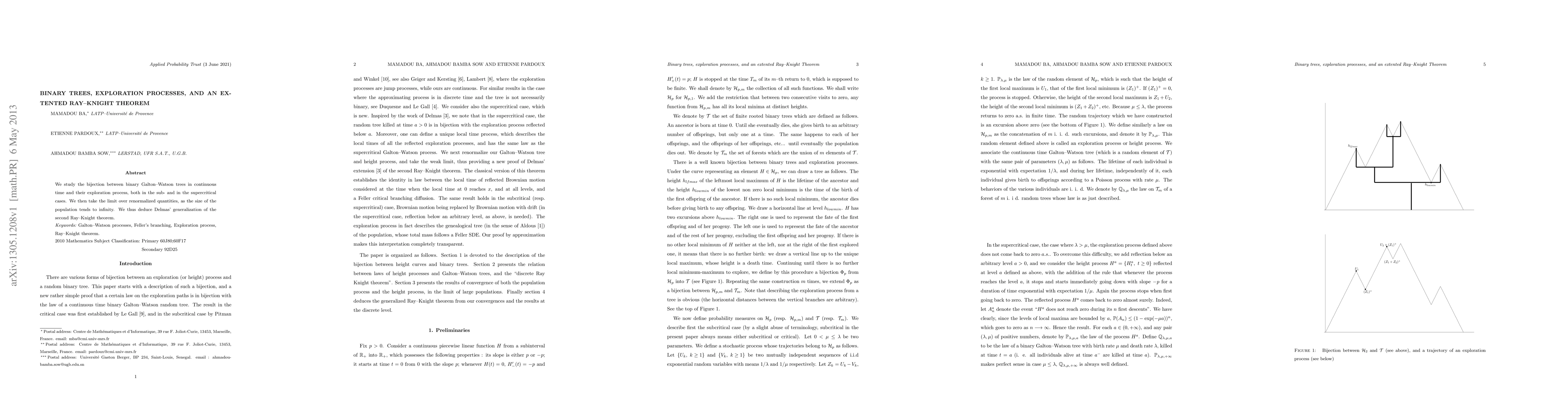This paper explores the connection between binary Galton-Watson trees in continuous time and their exploration process, leading to a generalization of Ray-Knight theorem. It studies both sub- and supercritical cases and takes limits over renormalized quantities to deduce a new result.