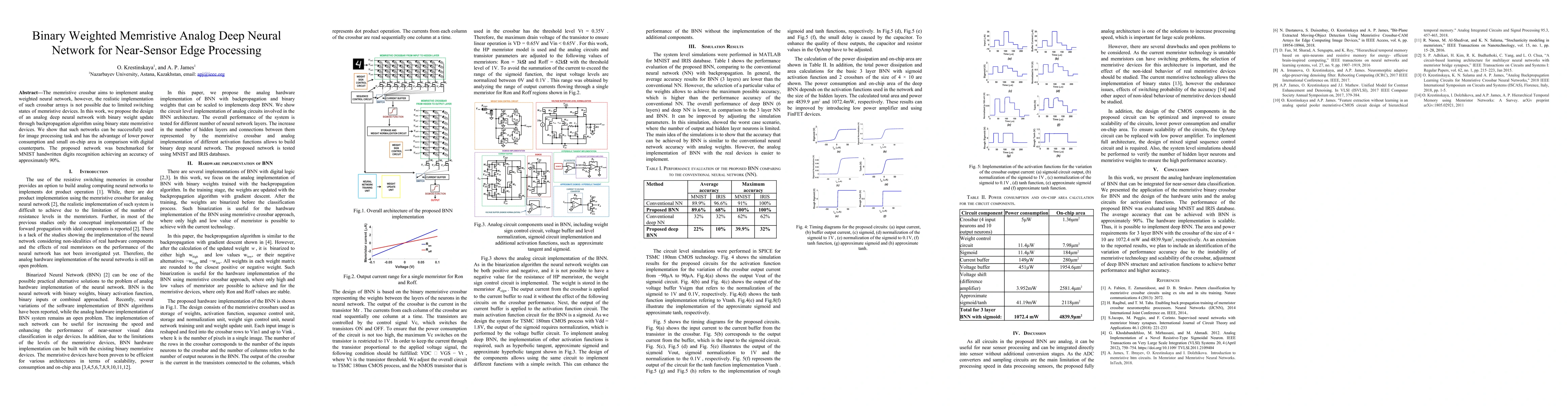 This paper proposes a binary weighted memristive analog deep neural network for efficient near-sensor edge processing, utilizing binary state memristive devices to achieve lower power consumption and smaller on-chip area. The network was tested on MNIST handwritten digits recognition, achieving an accuracy of around 90%.