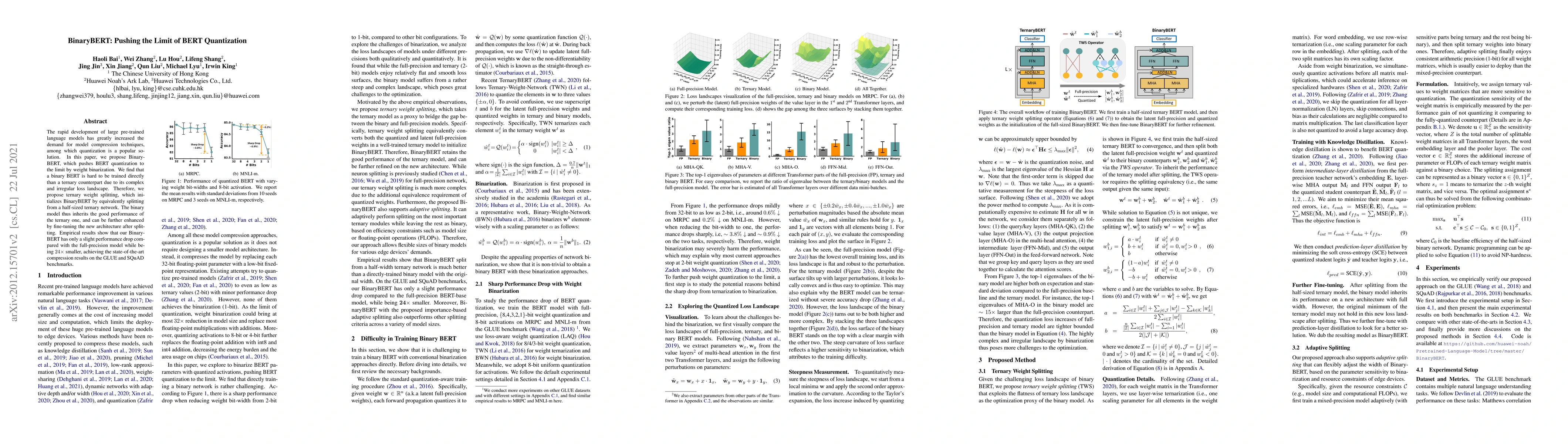 This paper proposes BinaryBERT, a method for pushing BERT quantization limits through weight binarization. To address the training difficulty of binary BERT, the authors introduce ternary weight splitting, which initializes binary BERT by splitting from a half-sized ternary network, achieving state-of-the-art compression with only a slight performance drop on GLUE and SQuAD benchmarks.