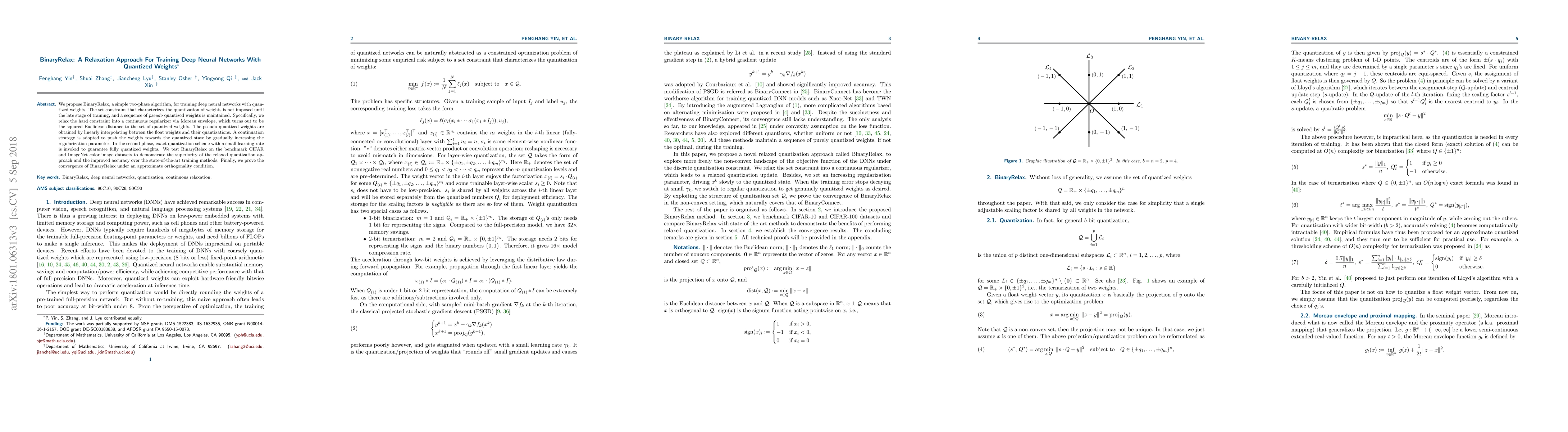 BinaryRelax introduces a two-phase algorithm for training deep neural networks with quantized weights, using a continuous regularizer to relax the quantization constraint and gradually transitioning to exact quantization. This approach improves accuracy on CIFAR and ImageNet datasets compared to state-of-the-art methods.