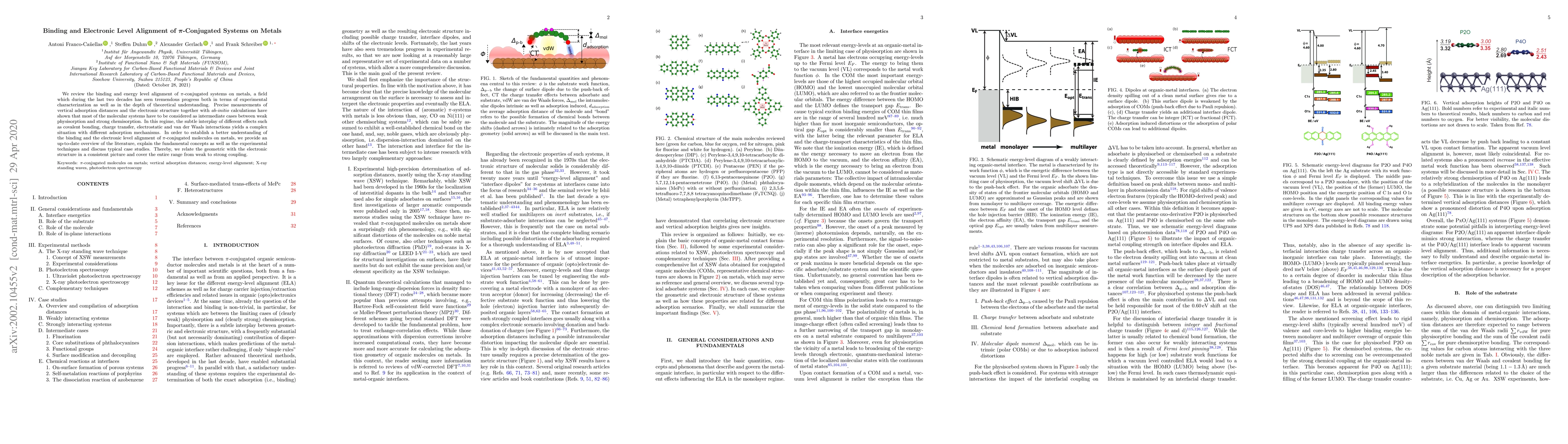 We review the binding and energy level alignment of $\pi$-conjugated systems on metals, a field which during the last two decades has seen tremendous progress both in terms of experimental characterization as well as in the depth of theoretical understanding. Precise measurements of vertical adsorption distances and the electronic structure together with \textit{ab-initio} calculations have shown that most of the molecular systems have to be considered as intermediate cases between weak physisorption and strong chemisorption. In this regime, the subtle interplay of different effects such as covalent bonding, charge transfer, electrostatic and van der Waals interactions yields a complex situation with different adsorption mechanisms. In order to establish a better understanding of the binding and the electronic level alignment of $\pi$-conjugated molecules on metals, we provide an up-to-date overview of the literature, explain the fundamental concepts as well as the experimental techniques and discuss typical case studies. Thereby, we relate the geometric with the electronic structure in a consistent picture and over the entire range from weak to strong coupling.
