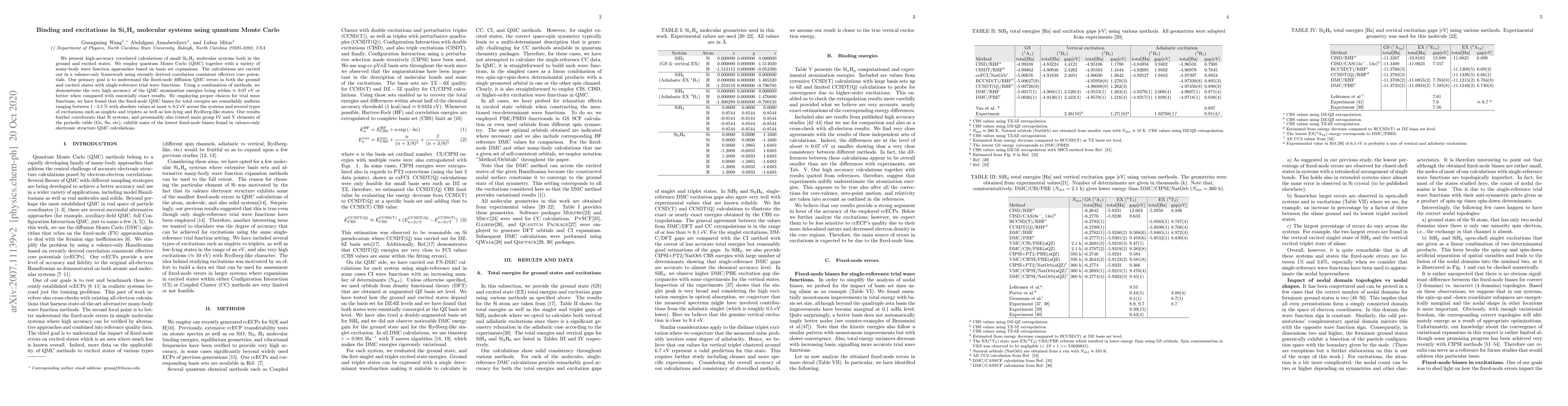 We present high-accuracy correlated calculations of small Si$_x$H$_y$ molecular systems both in the ground and excited states. We employ quantum Monte Carlo (QMC) together with a variety of many-body wave function approaches based on basis set expansions. The calculations are carried out in a valence-only framework using recently derived correlation consistent effective core potentials. Our primary goal is to understand the fixed-node diffusion QMC errors in both the ground and excited states with single-reference trial wave functions. Using a combination of methods, we demonstrate the very high accuracy of the QMC atomization energies being within $\approx$ 0.07 eV or better when compared with essentially exact results. By employing proper choices for trial wave functions, we have found that the fixed-node QMC biases for total energies are remarkably uniform ranging between $1-3.5$ % with absolute values at most $\approx$ 0.2 eV across the systems and several types of excitations such as singlets and triplets as well as low-lying and Rydberg-like states. Our results further corroborate that Si systems, and presumably also related main group IV and V elements of the periodic table (Ge, Sn, etc), exhibit some of the lowest fixed-node biases found in valence-only electronic structure QMC calculations.