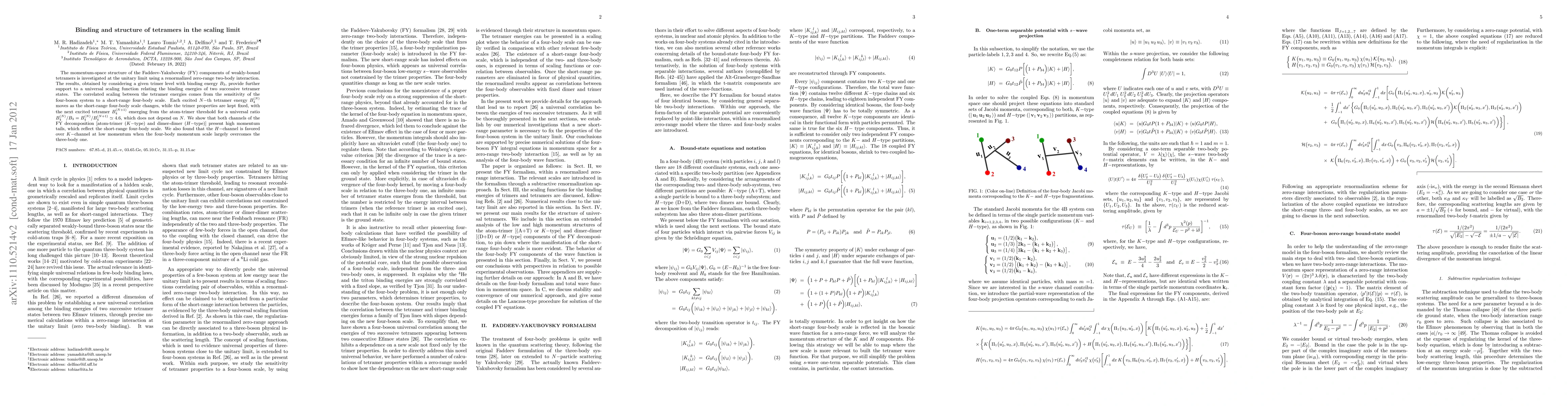 The momentum-space structure of the Faddeev-Yakubovsky (FY)components of weakly-bound tetramers is investigated at the unitary limit using a renormalized zero-range two-body interaction. The results, obtained by considering a given trimer level with binding energy $B_3$, provide further support to a universal scaling function relating the binding energies of two successive tetramer states. The correlated scaling between the tetramer energies comes from the sensitivity of the four-boson system to a short-range four-body scale. Each excited $N-$th tetramer energy $B_4^{(N)}$ moves as the short-range four-body scale changes, while the trimer properties are kept fixed, with the next excited tetramer $B_4^{(N+1)}$ emerging from the atom-trimer threshold for a universal ratio $B_4^{(N)}/B_3 = B_4^ {(N)}/B_4^{(N+1)} \simeq 4.6$, which does not depend on $N$. We show that both channels of the FY decomposition [atom-trimer ($K-$type) and dimer-dimer ($H-$type)] present high momentum tails, which reflect the short-range four-body scale. We also found that the $H-$channel is favored over $K-$channel at low momentum when the four-body momentum scale largely overcomes the three-body one.