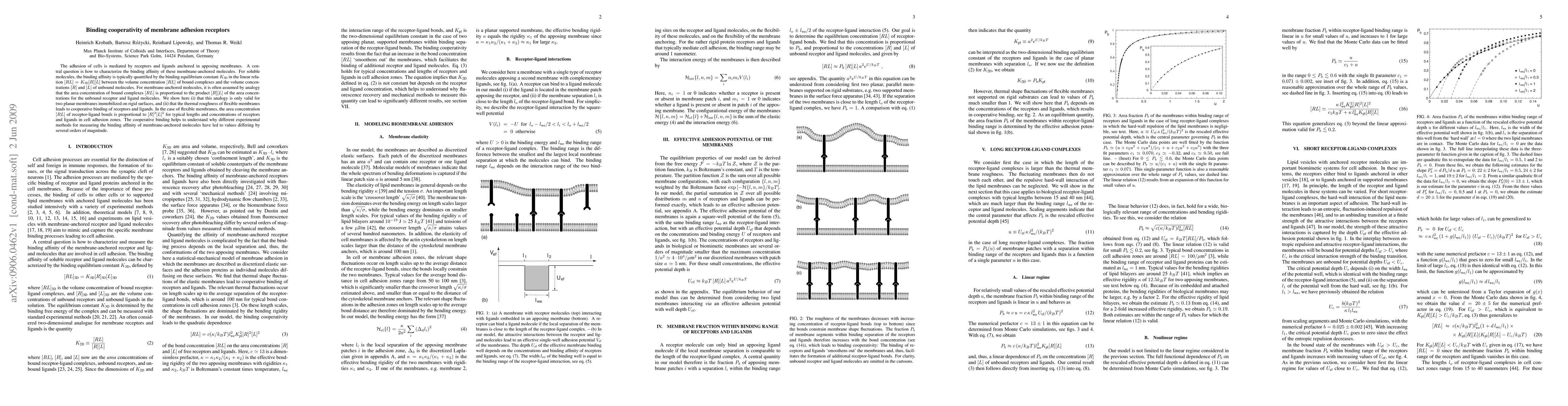 This paper investigates the binding cooperativity of membrane adhesion receptors, demonstrating that the binding affinity for flexible membranes is cooperative and proportional to the square of the product of receptor and ligand concentrations, unlike the linear relationship assumed for rigid surfaces. This explains discrepancies in experimental measurements of binding affinity for membrane-anchored molecules.