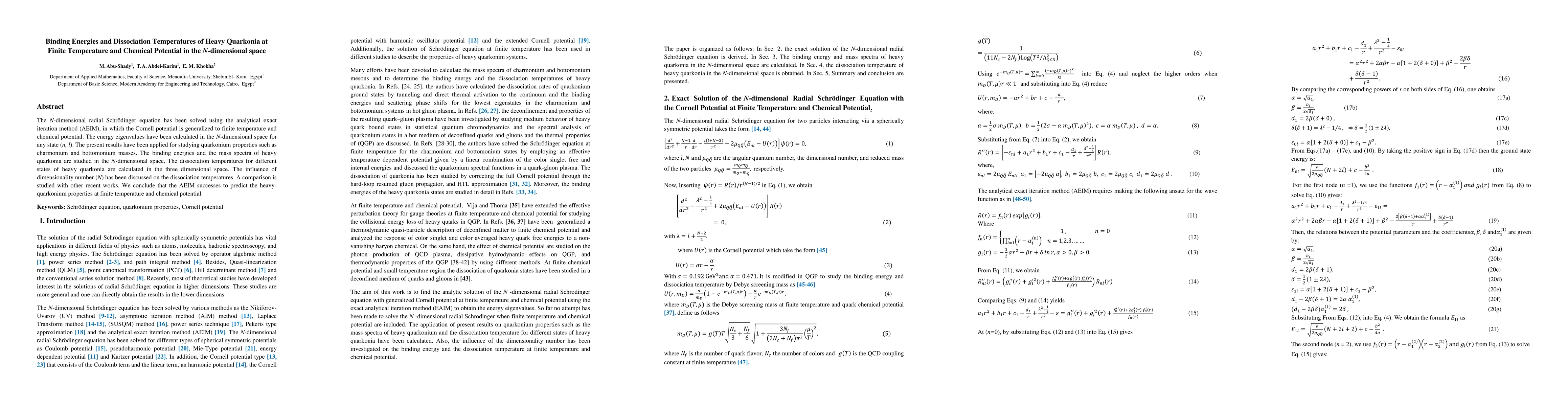 This paper uses the analytical exact iteration method (AEIM) to solve the N-dimensional radial Schrödinger equation with a generalized Cornell potential, calculating binding energies and dissociation temperatures for heavy quarkonia at finite temperature and chemical potential. The study finds that dimensionality affects dissociation temperatures and compares results with recent works, concluding AEIM's success in predicting these properties.