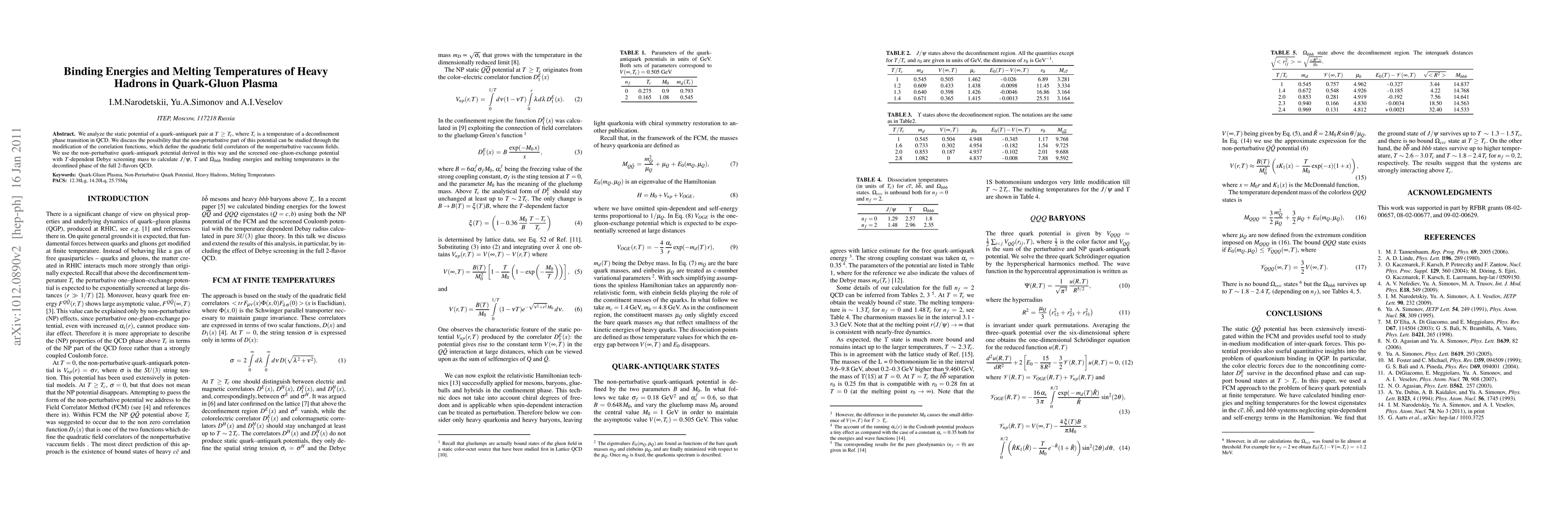 We analyze the static potential of a quark-antiquark pair at $T\,\geq\,T_c$, where $T_c$ is a temperature of a deconfinement phase transition in QCD. We discuss the possibility that the non-perturbative part of this potential can be studied through the modification of the correlation functions, which define the quadratic field correlators of the nonperturbative vaccuum fields. We use the non-perturbative quark-antiquark potential derived in this way and the screened one-gluon-exchange potential with $T$-dependent Debye screening mass to calculate $J/\psi$, $\Upsilon$ and $\Omega_{bbb}$ binding energies and melting temperatures in the deconfined phase of the full 2-flavors QCD.