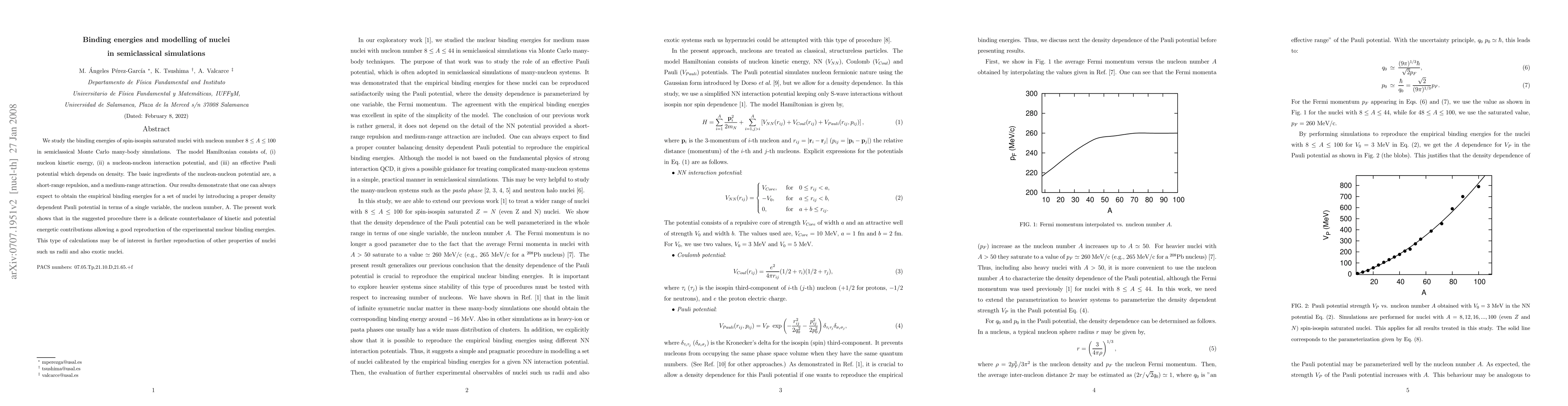 This paper investigates the binding energies of spin-isospin saturated nuclei using semiclassical Monte Carlo simulations, finding that a density-dependent Pauli potential can reproduce empirical binding energies. The study proposes a pragmatic modelling method for nuclei calibrated by empirical data, which can be further tested in simulations.