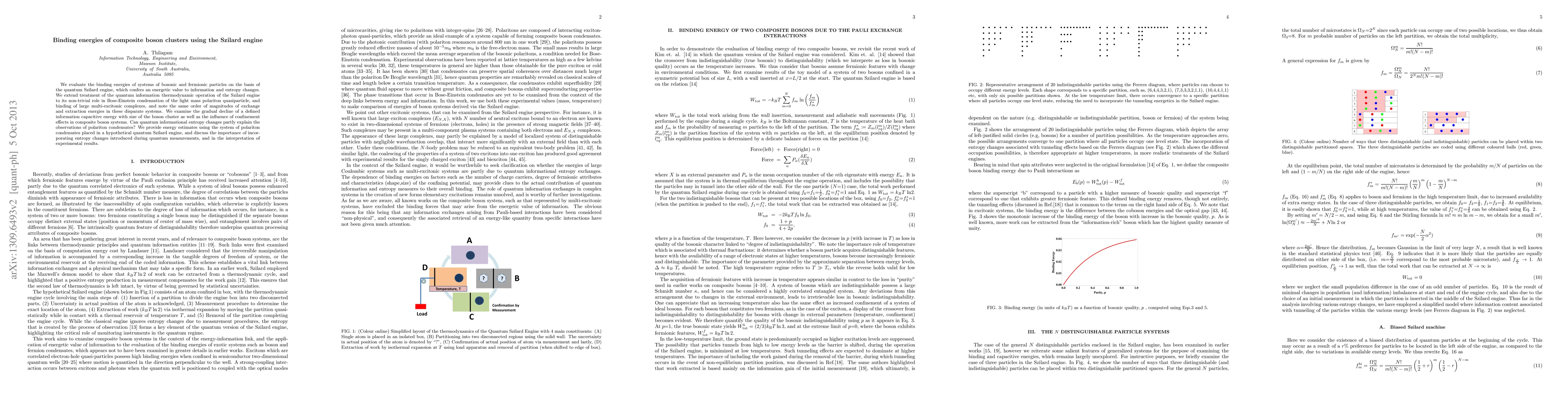 We evaluate the binding energies of systems of bosonic and fermionic particles on the basis of the quantum Szilard engine, which confers an energetic value to information and entropy changes. We extend treatment of the quantum information thermodynamic operation of the Szilard engine to its non-trivial role in Bose-Einstein condensation of the light mass polariton quasiparticle, and binding of large multi-excitonic complexes, and note the same order of magnitudes of exchange and extraction energies in these disparate systems. We examine the gradual decline of a defined information capacitive energy with size of the boson cluster as well as the influence of confinement effects in composite boson systems. Can quantum informational entropy changes partly explain the observations of polariton condensates? We provide energy estimates using the system of polariton condensates placed in a hypothetical quantum Szilard engine, and briefly discuss the importance of incorporating entropy changes introduced during quantum measurements, and in the interpretation of experimental results.