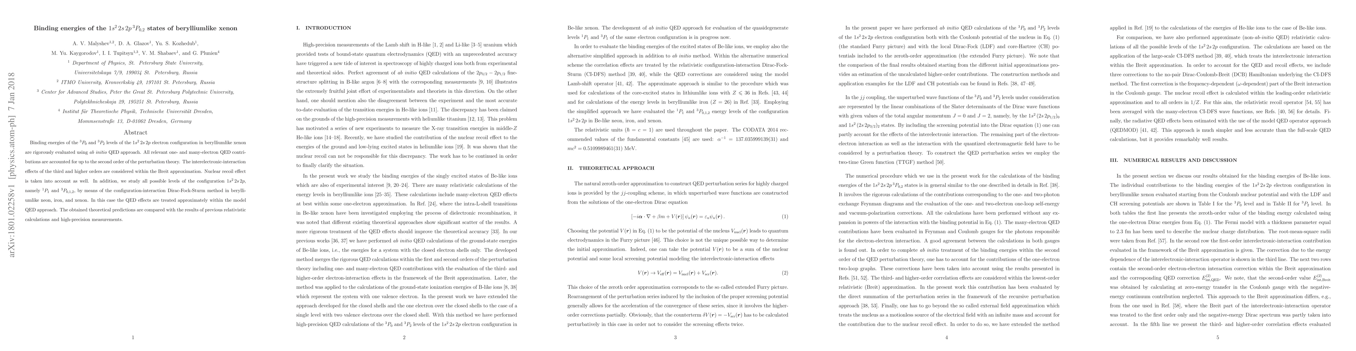 This study rigorously evaluates binding energies of specific electron levels in berylliumlike xenon using an advanced ab initio QED approach, accounting for various electron-electron interaction and nuclear recoil effects. The results are compared with previous calculations and measurements, demonstrating high precision in theoretical predictions.