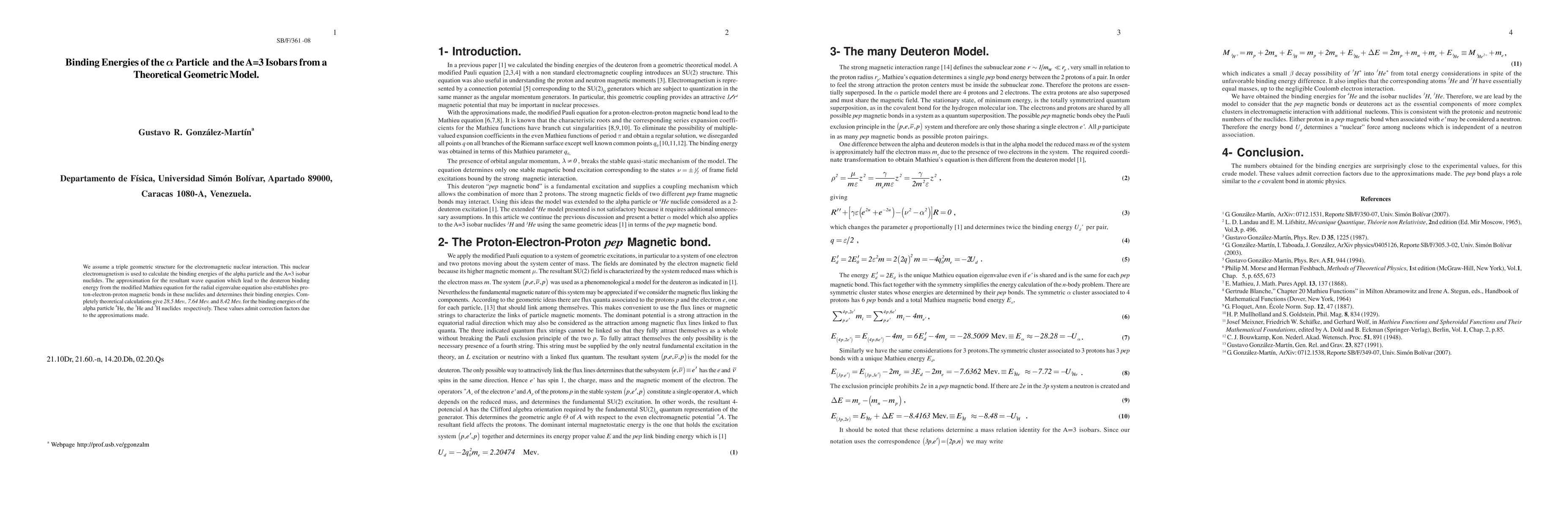 We assume a triple geometric structure for the electromagnetic nuclear interaction. This nuclear electromagnetism is used to calculate the binding energies of the alpha particle and the A=3 isobar nuclides. The approximation for the resultant wave equation which lead to the deuteron binding energy from the modified Mathieu equation for the radial eigenvalue equation also establishes proton-electron-proton magnetic bonds in these nuclides and determines their binding energies. Completely theoretical calculations give 28.5 Mev., 7.64 Mev. and 8.42 Mev. for the binding energies of the alpha particle, the helium 3 isotope and tritium respectively. These values admit correction factors due to the approximations made.