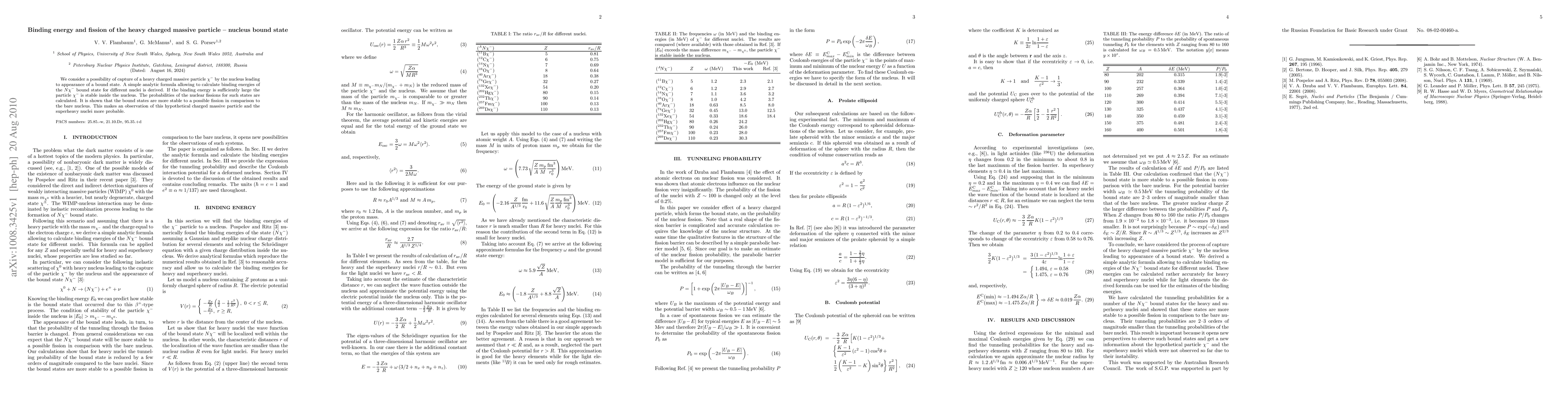 We consider a possibility of capture of a heavy charged massive particle $\chi^-$ by the nucleus leading to appearance of a bound state. A simple analytic formula allowing to calculate binding energies of the $N\chi^-$ bound state for different nuclei is derived. If the binding energy is sufficiently large the particle $\chi^-$ is stable inside the nucleus. The probabilities of the nuclear fissions for such states are calculated. It is shown that the bound states are more stable to a possible fission in comparison to the bare nucleus. This makes an observation of this hypothetical charged massive particle and the superheavy nuclei more probable.