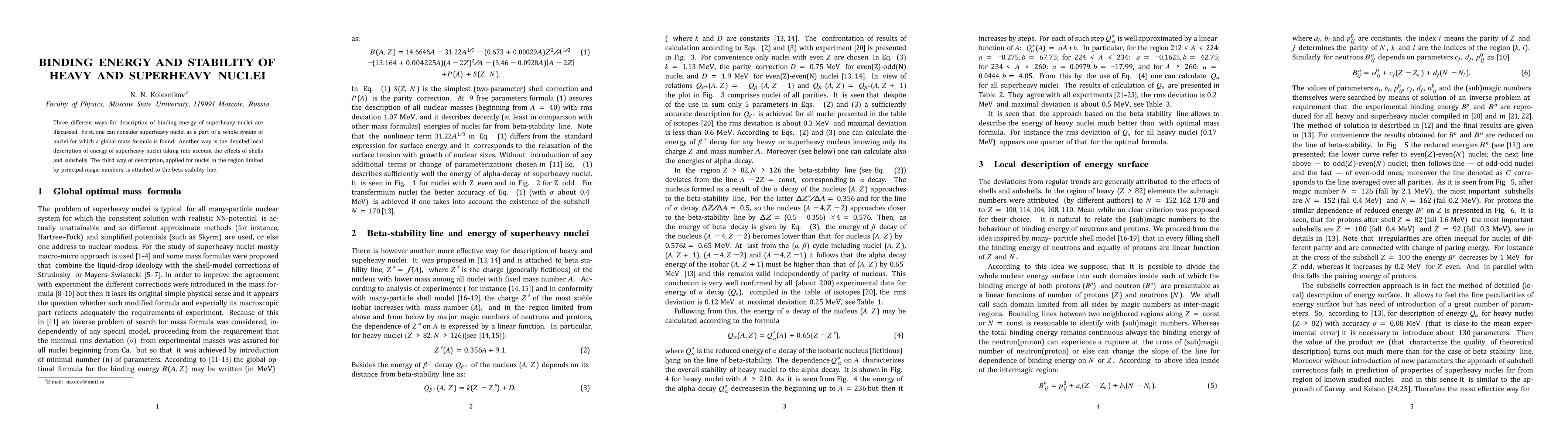 This paper explores three methods for describing the binding energy of superheavy nuclei: a global mass formula approach, a detailed local shell model, and a method tied to the beta-stability line near principal magic numbers. Each method provides insights into the stability of these nuclei.