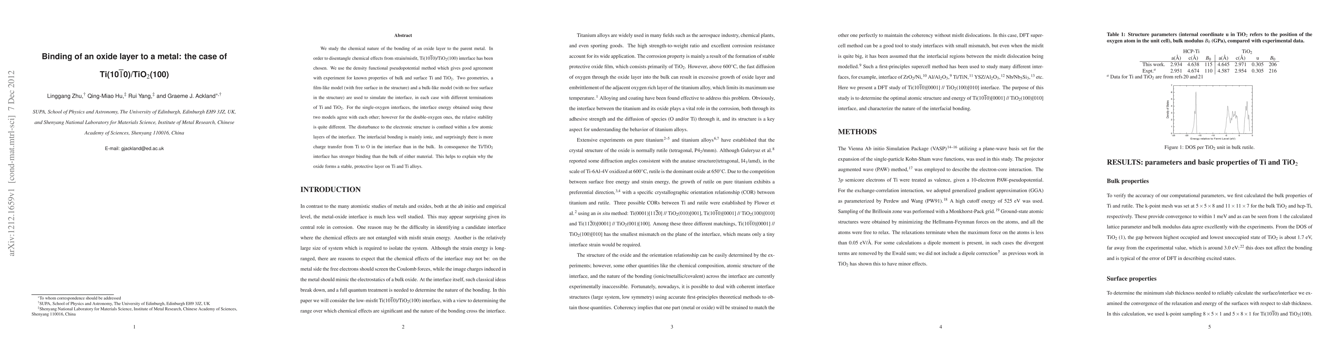 Researchers studied the bonding of an oxide layer to a metal using density functional pseudopotential method, finding that the interface has stronger binding than the bulk due to more charge transfer from Ti to O.