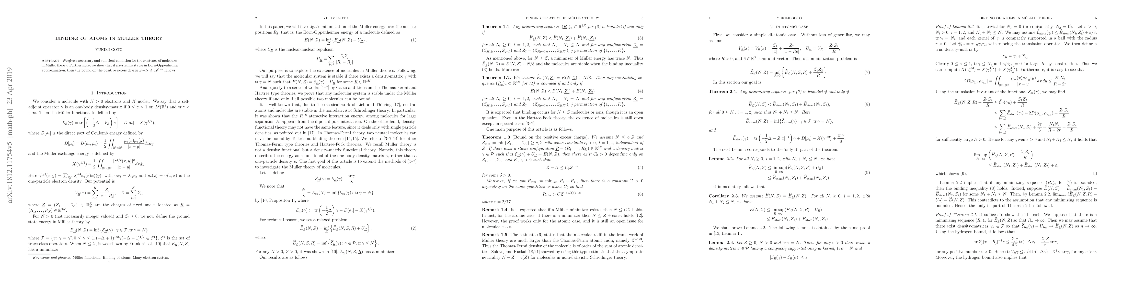 We give a necessary and sufficient condition for the existence of molecules in M\"uller theory. Furthermore, we show that if a system is stable in Born-Oppenheimer approximation, then the bound on the positive excess charge $ Z-N \le cZ^{1-\epsilon}$ follows.