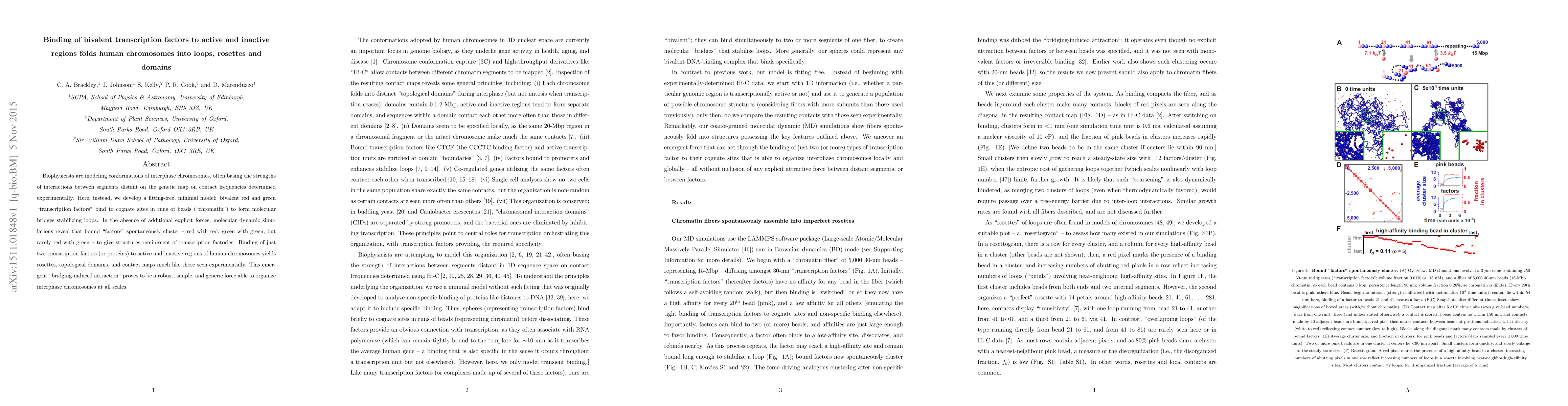 This paper develops a minimal model to simulate chromosome folding, showing that bivalent transcription factors binding to chromatin can spontaneously form loops, rosettes, and domains, mimicking experimental observations without additional forces. The "bridging-induced attraction" from binding these factors is a robust mechanism for organizing interphase chromosomes.