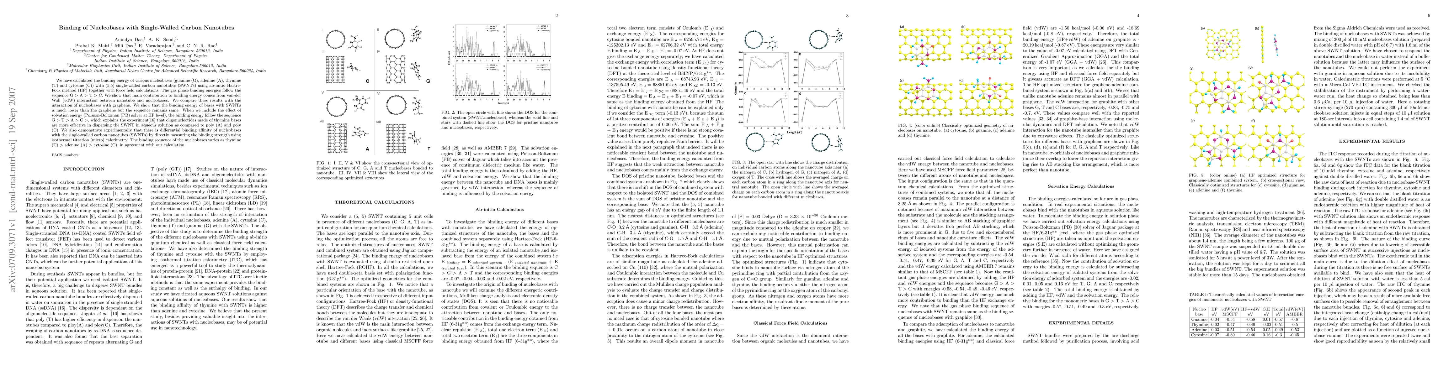 This research investigates the binding energies of nucleobases (G, A, T, C) with single-walled carbon nanotubes (SWNTs) using ab-initio calculations and compares these with graphene interactions. The findings reveal that van der Waals forces dominate the binding, with thymine showing higher binding in aqueous solutions, corroborated by experimental measurements using isothermal titration calorimetry.
