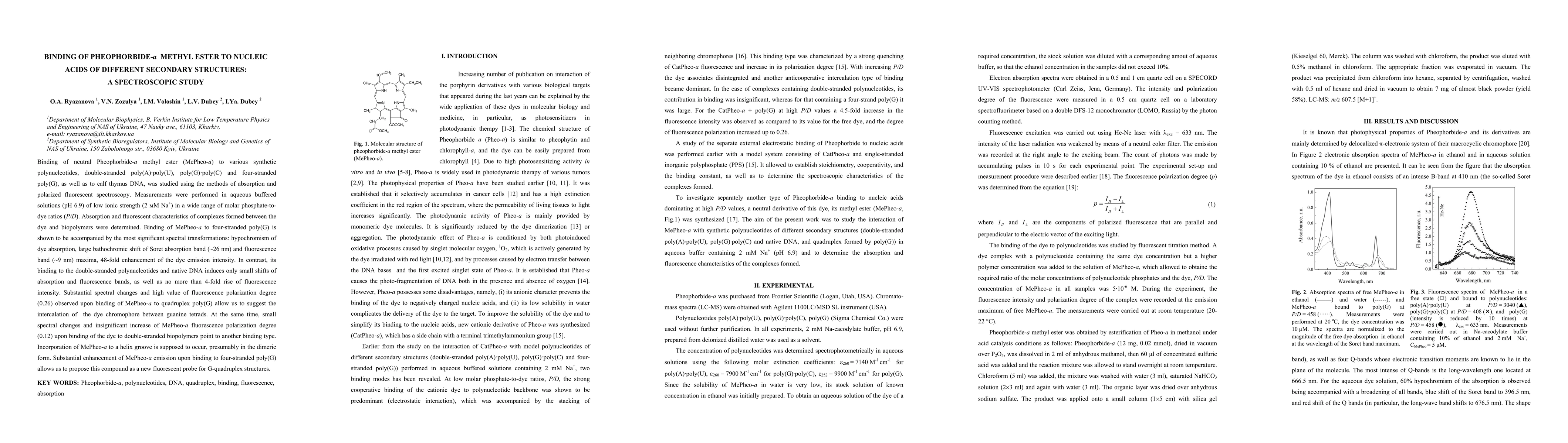 This study explores the binding of Pheophorbide-a methyl ester (MePheo-a) to various nucleic acids, revealing significant spectral changes and high fluorescence polarization when MePheo-a binds to four-stranded poly(G), suggesting intercalation. In contrast, binding to double-stranded DNA induces minor changes, indicating groove binding. The research proposes MePheo-a as a fluorescent probe for G-quadruplex structures, especially four-stranded poly(G).