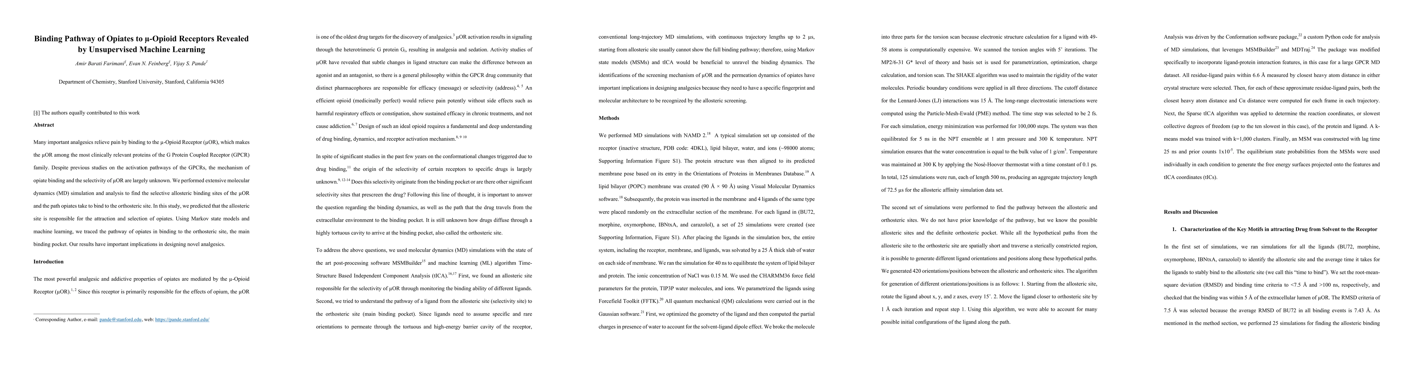 Many important analgesics relieve pain by binding to the $\mu$-Opioid Receptor ($\mu$OR), which makes the $\mu$OR among the most clinically relevant proteins of the G Protein Coupled Receptor (GPCR) family. Despite previous studies on the activation pathways of the GPCRs, the mechanism of opiate binding and the selectivity of $\mu$OR are largely unknown. We performed extensive molecular dynamics (MD) simulation and analysis to find the selective allosteric binding sites of the $\mu$OR and the path opiates take to bind to the orthosteric site. In this study, we predicted that the allosteric site is responsible for the attraction and selection of opiates. Using Markov state models and machine learning, we traced the pathway of opiates in binding to the orthosteric site, the main binding pocket. Our results have important implications in designing novel analgesics.