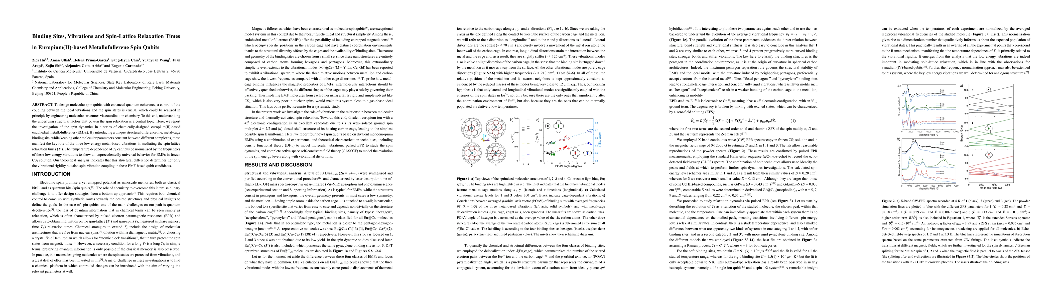 To design molecular spin qubits with enhanced quantum coherence, a control of the coupling between the local vibrations and the spin states is crucial, which could be realized in principle by engineering molecular structures via coordination chemistry. To this end, understanding the underlying structural factors that govern the spin relaxation is a central topic. Here, we report the investigation of the spin dynamics in a series of chemically-designed europium(II)-based endohedral metallofullerenes (EMFs). By introducing a unique structural difference, i.e. metal-cage binding site, while keeping other molecular parameters constant between different complexes, these manifest the key role of the three low energy metal-based vibrations in mediating the spin-lattice relaxation times (T1). The temperature dependence of T1 can thus be normalized by the frequencies of these low energy vibrations to show an unprecedentedly universal behavior for EMFs in frozen CS2 solution. Our theoretical analysis indicates that this structural difference determines not only the vibrational rigidity but also spin-vibration coupling in these EMF-based qubit candidates.
